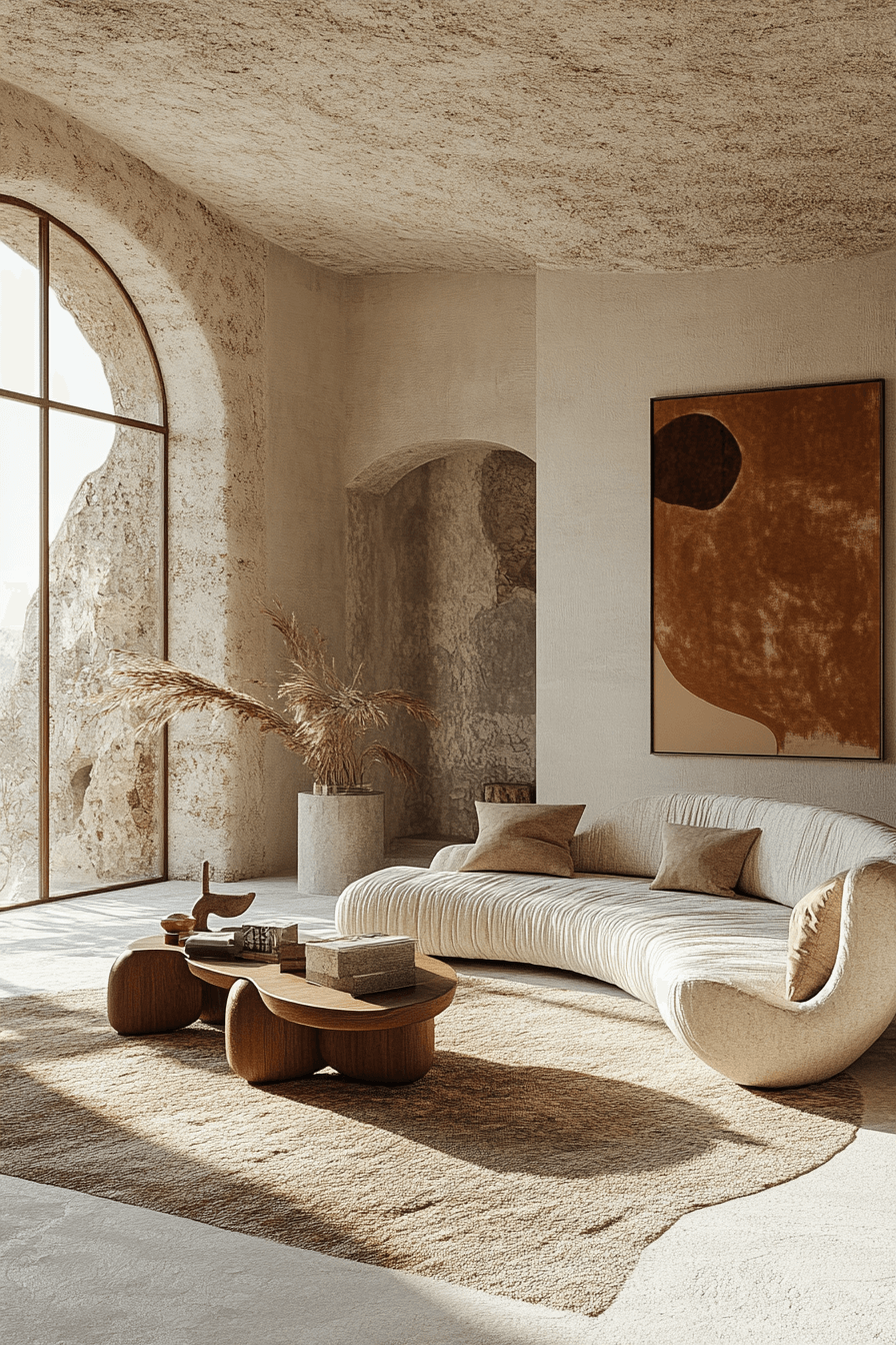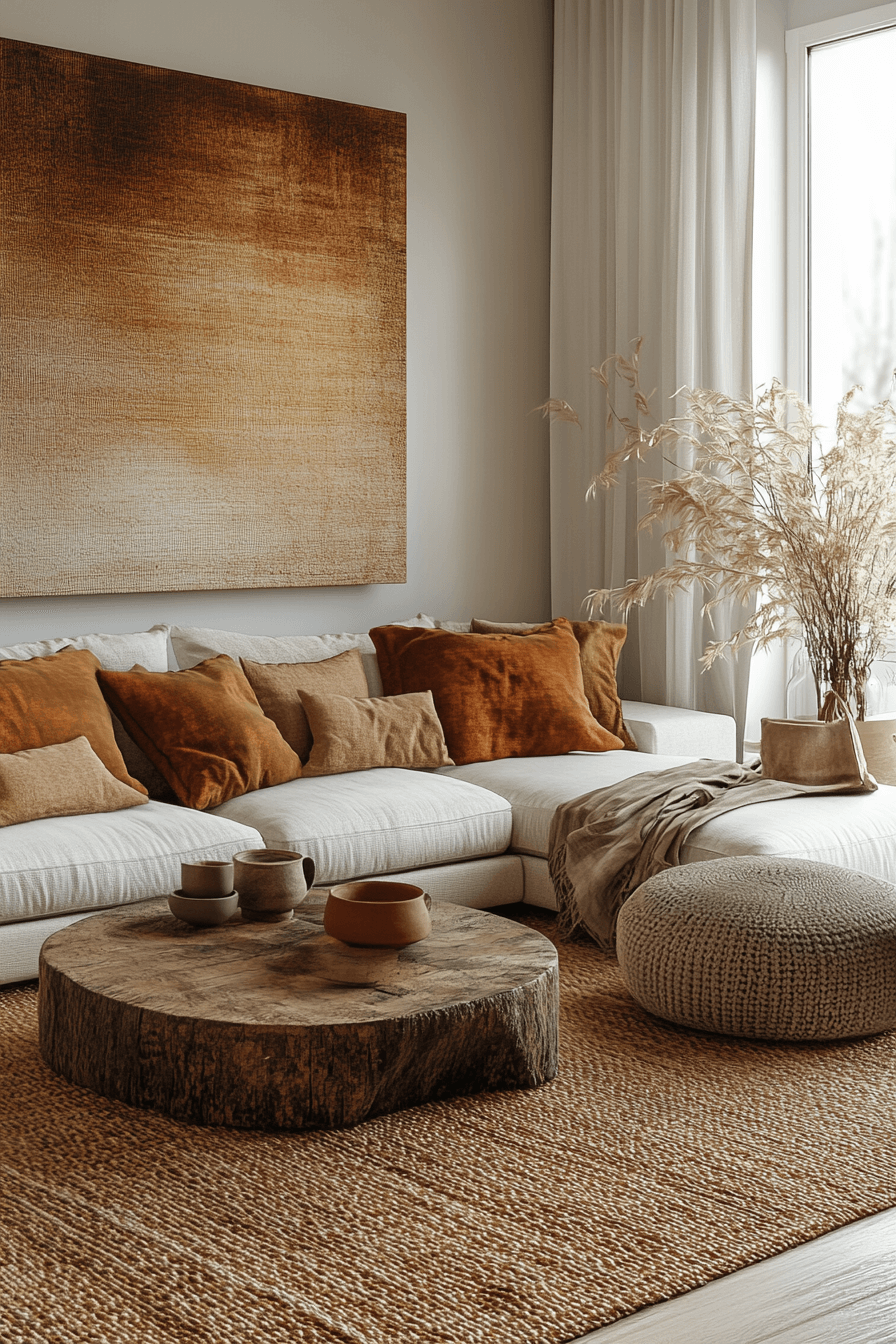 Highlight creativity with abstract earth elements like organic wall art, sculptural vases, and patterned cushions. Keep the palette earthy for cohesion. Mix tactile and smooth finishes for visual interest. This approach feels artistic yet grounded.