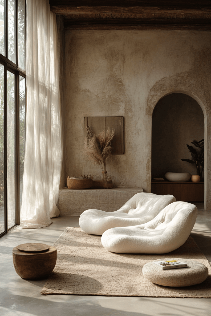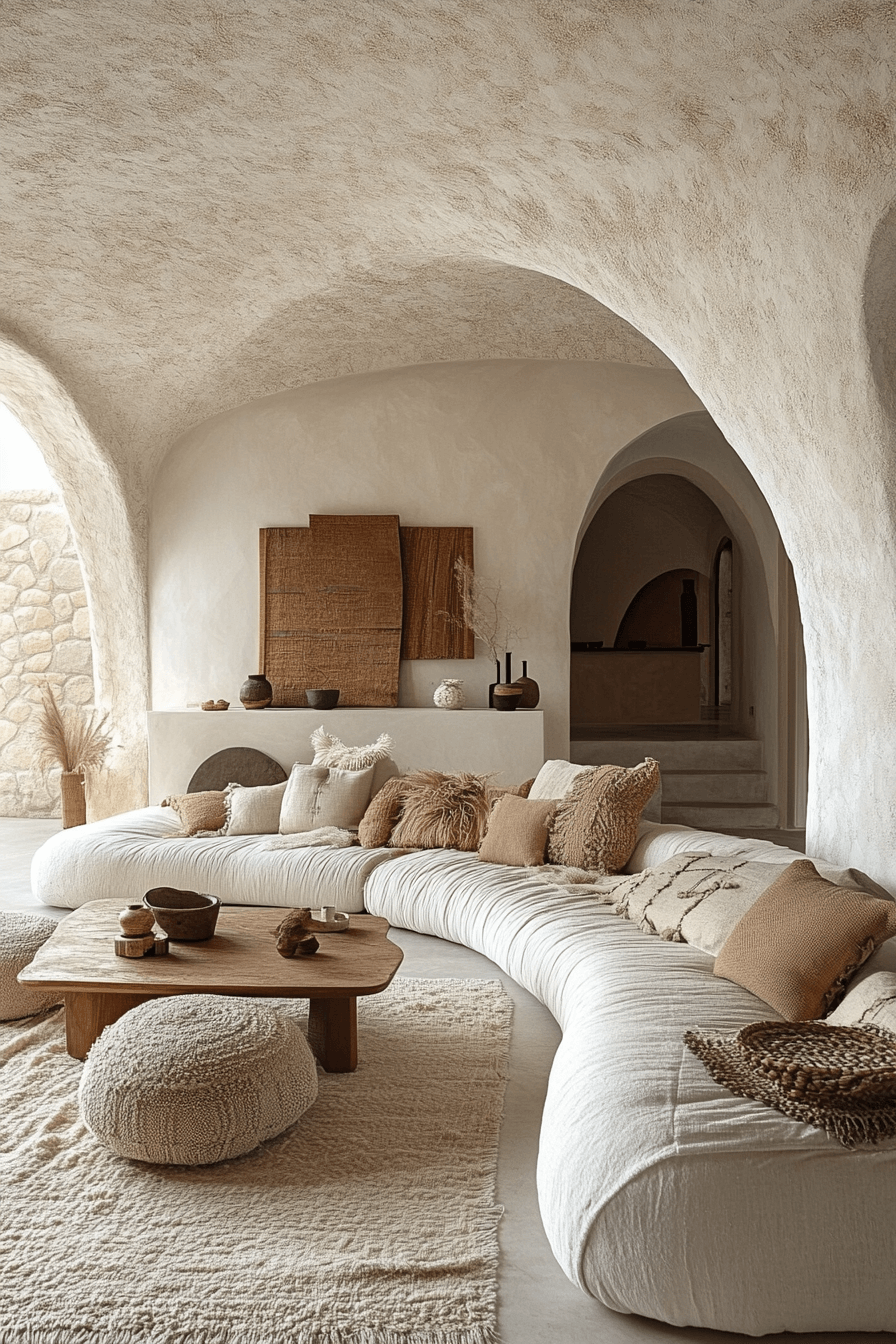 Soften your space with curved comfort through rounded armchairs, oval coffee tables, and arched doorways. Pair with light fabrics for an inviting touch. Use layered rugs for visual warmth. The shapes make the space feel approachable.