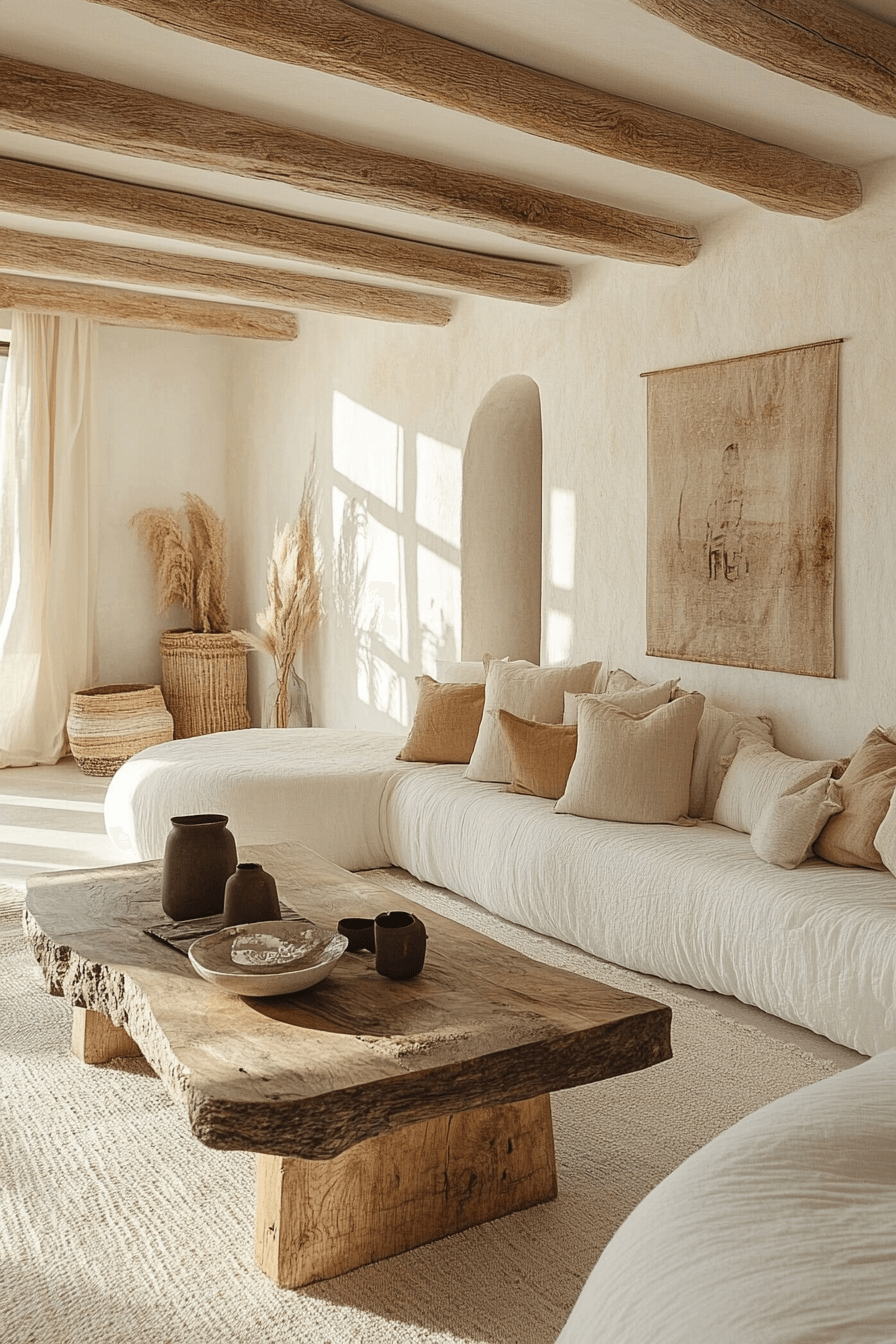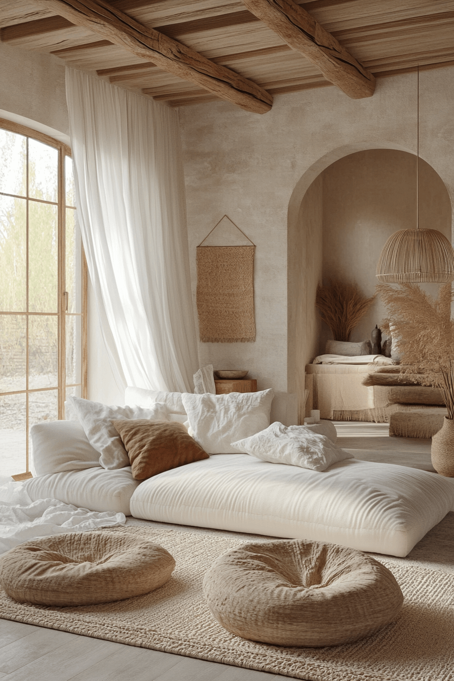 Embrace a minimalist boho approach with clean lines, light woods, and woven textures. Keep your color palette warm but understated. A few curated decor pieces let the textures shine. Natural light enhances the simple beauty.