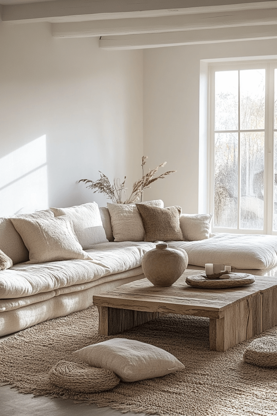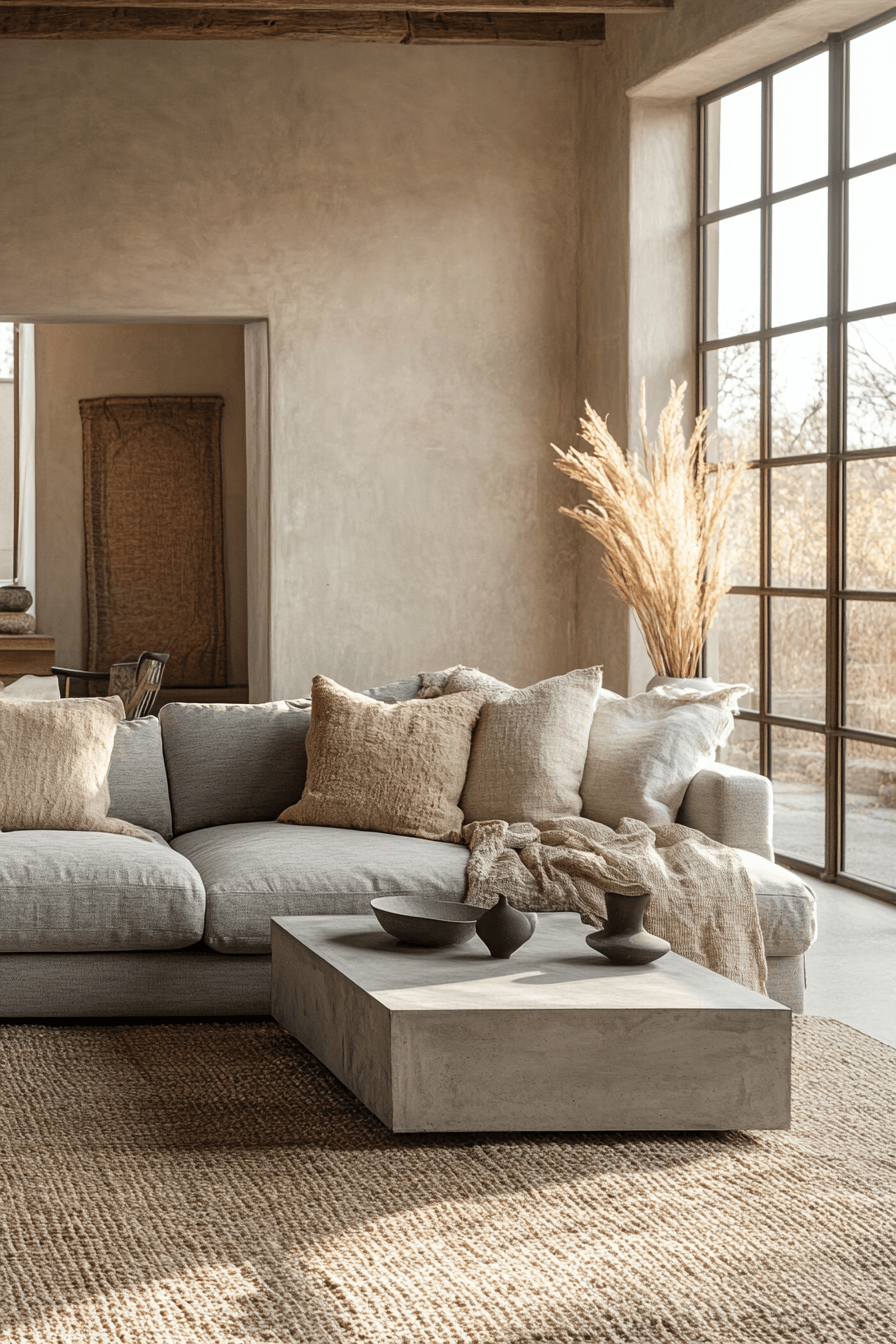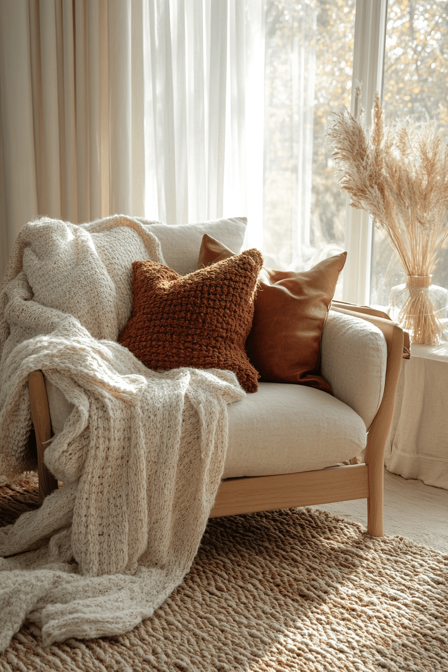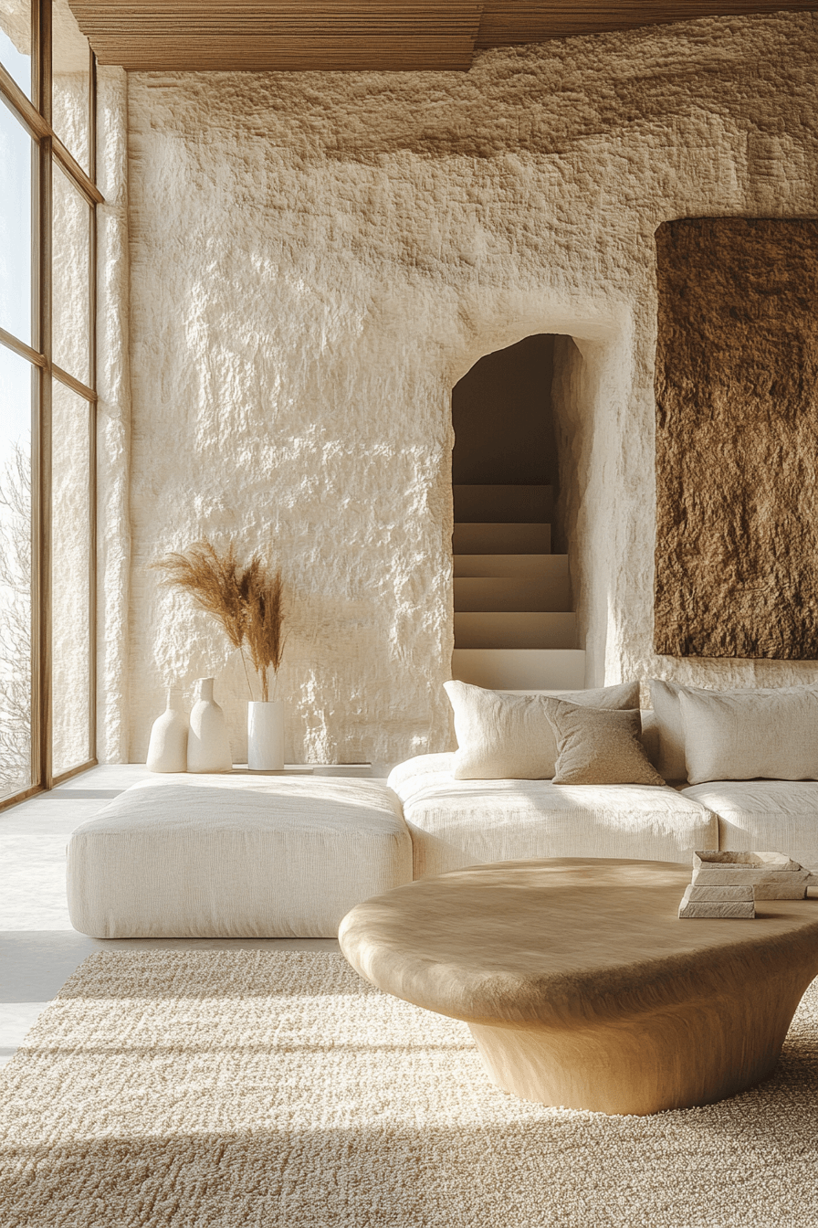 Go for a cozy yet refined vibe with a warm monochrome scheme of tan, almond, and sand tones. Add depth with layered materials like wool, jute, and linen. Lighting with a warm glow enhances the richness. This approach is soothing yet elevated.