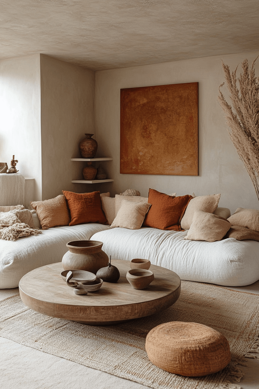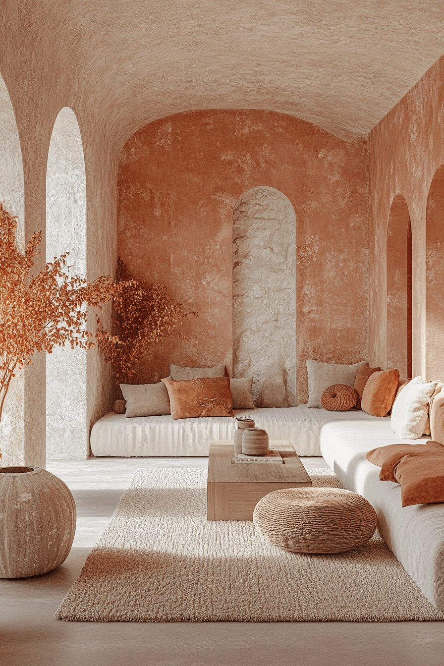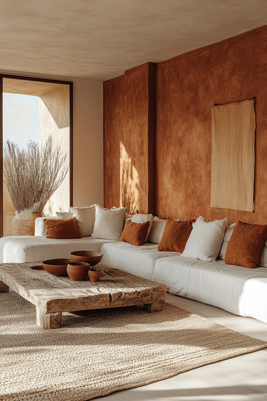 Use clay-inspired shades like rust, muted rose, and sandy beige for soft contrast. Pair with pale walls and light-toned wood. Add artistic pieces for impact. Keep accessories minimal for focus.