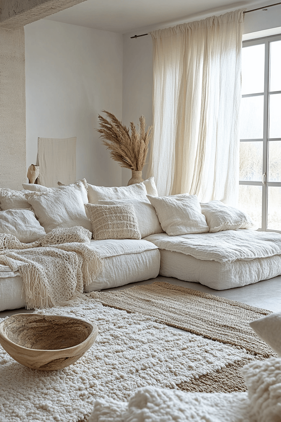 Layer breezy linen fabrics for a relaxed and tactile modern boho living room. Pair sheer curtains with linen slipcovers for a cozy yet refined feel. A textured rug grounds the space. Neutral shades keep the room serene.