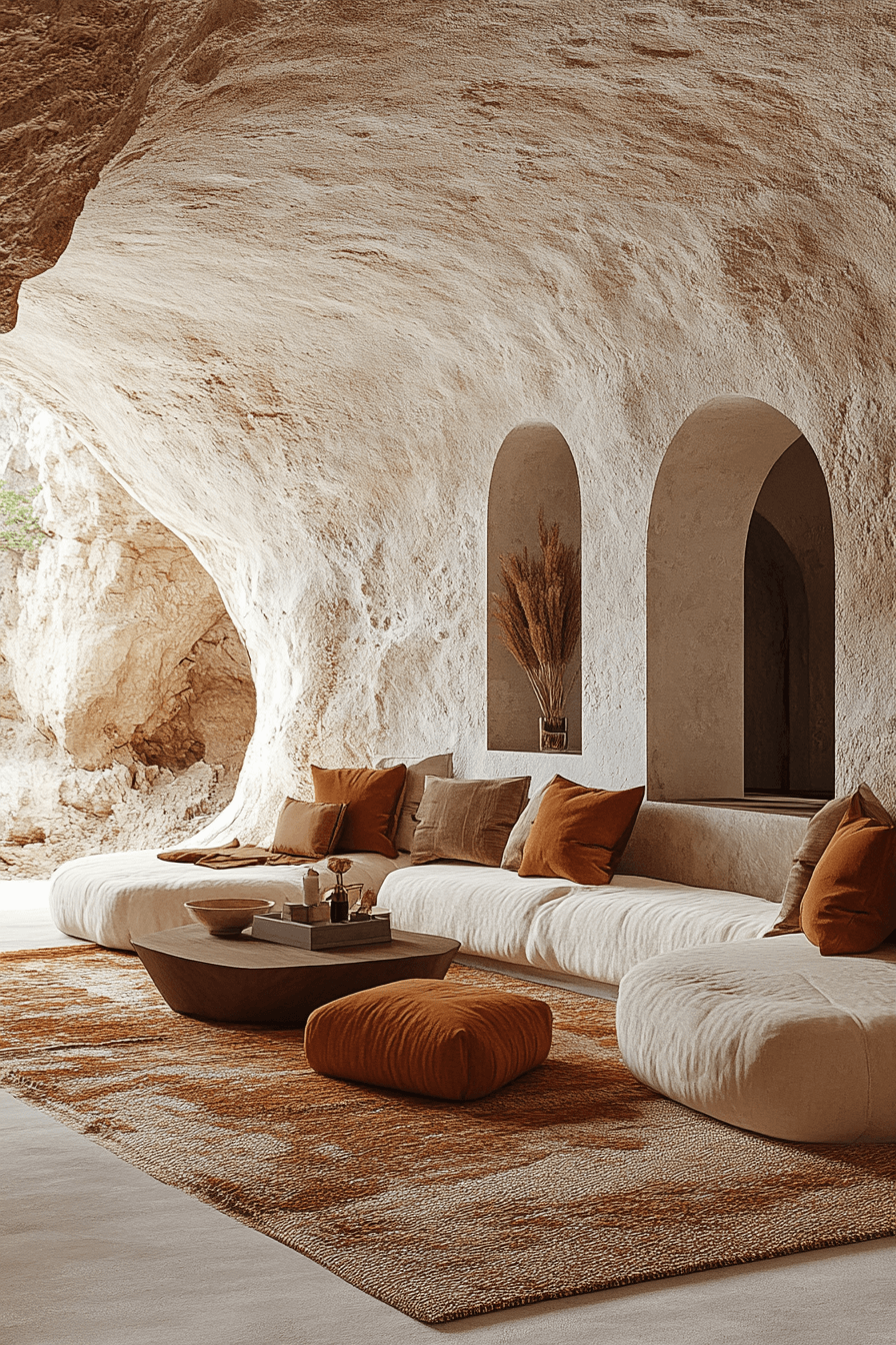 Take cues from sandstone formations with warm beige, muted gold, and pale tan tones. Add layered fabrics for depth. Keep furniture organic in shape. This palette feels both natural and inviting.