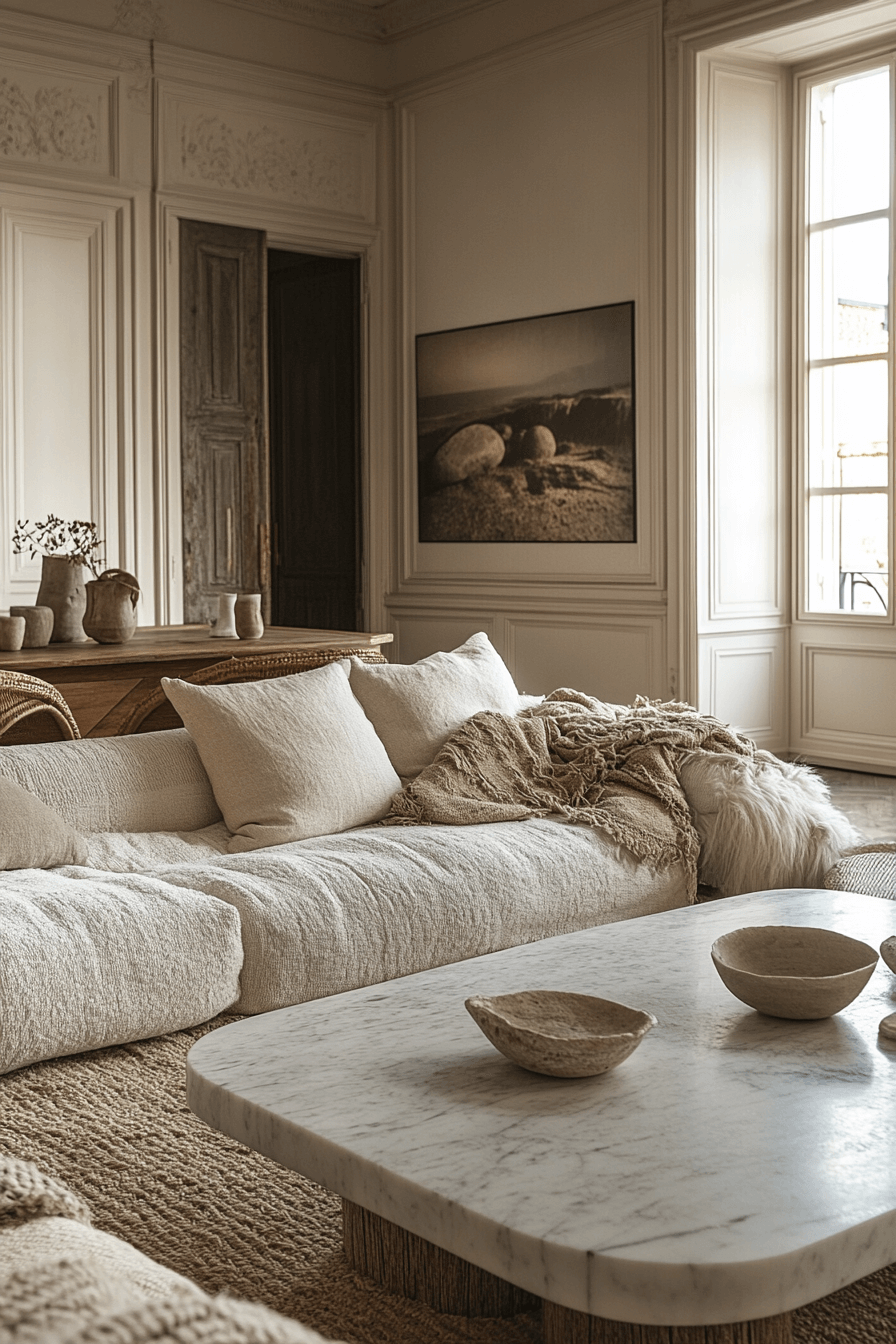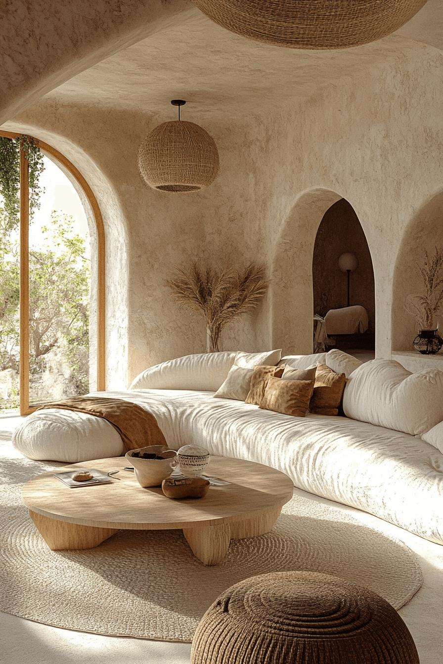 Create a sense of harmony with neutral motion in your modern boho living room. Blend ivory, oat, and light mocha tones. Use organic shapes for a flowing layout. Layer textures for depth.