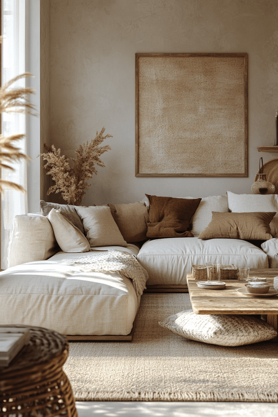 Channel sunlit desert charm in your modern boho living room with golden beige, terracotta, and muted peach. Low, cushioned seating encourages relaxation. Add natural fiber rugs and handmade pottery for authenticity. Soft lighting enhances the warm atmosphere.