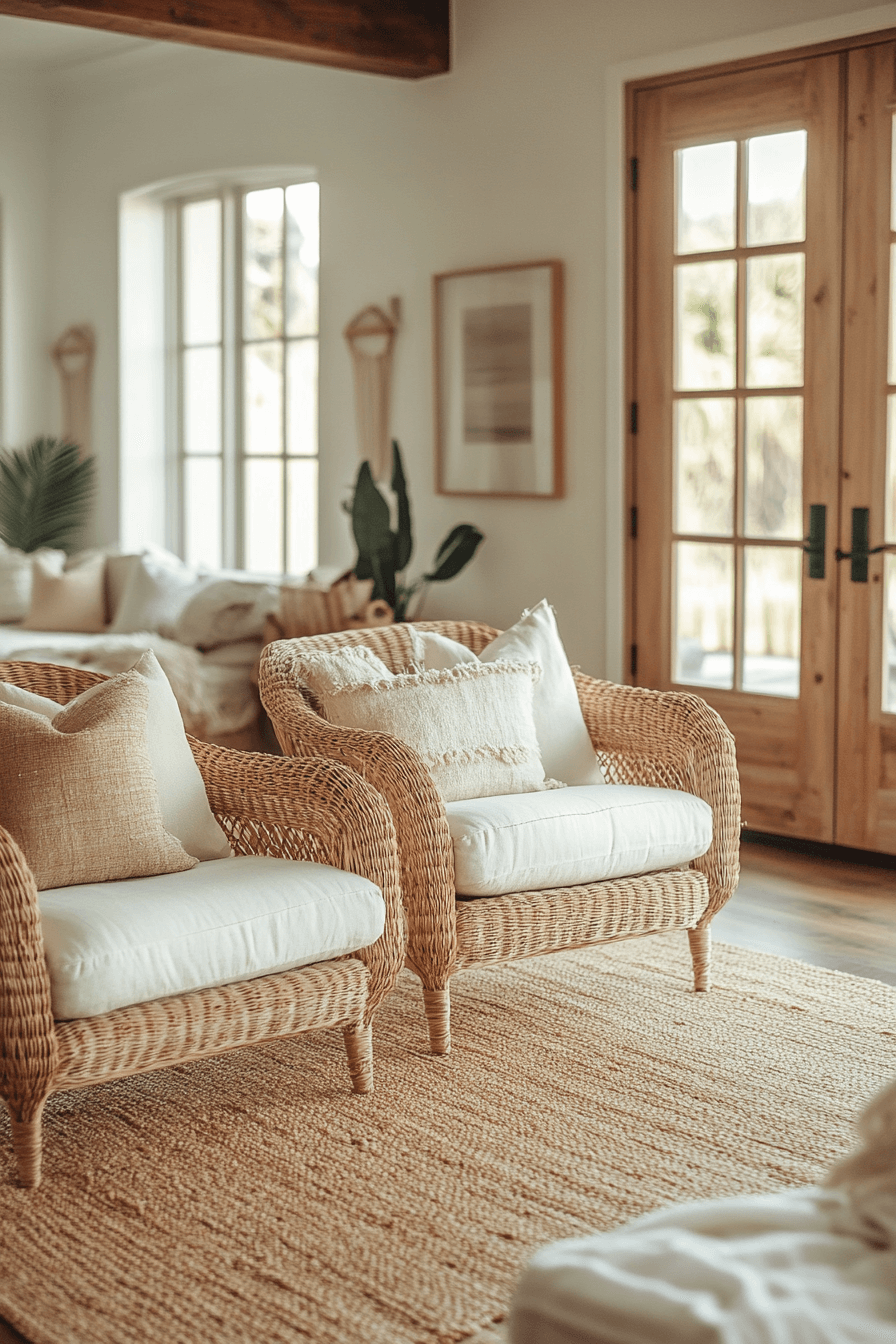 Add warmth and texture with woven accents like rattan chairs, wicker baskets, and cane cabinet fronts. Use muted neutrals to keep the style balanced. Mix with smooth ceramics for contrast. The blend of textures feels both organic and timeless.