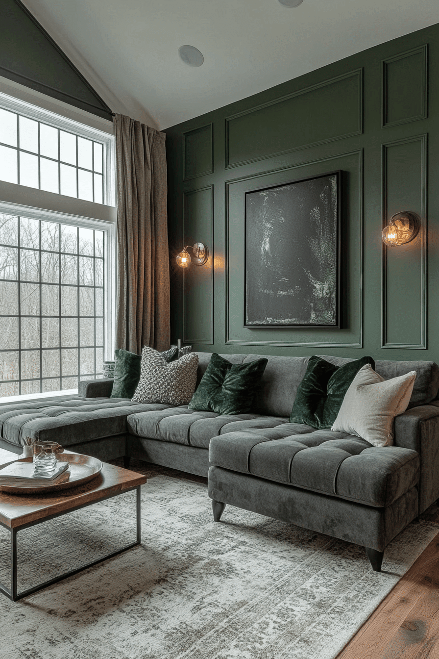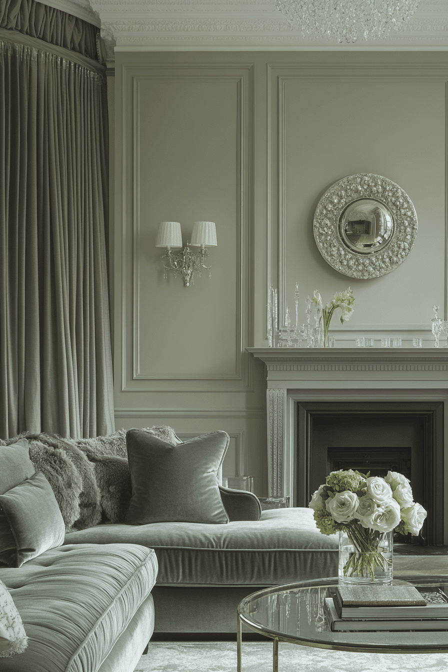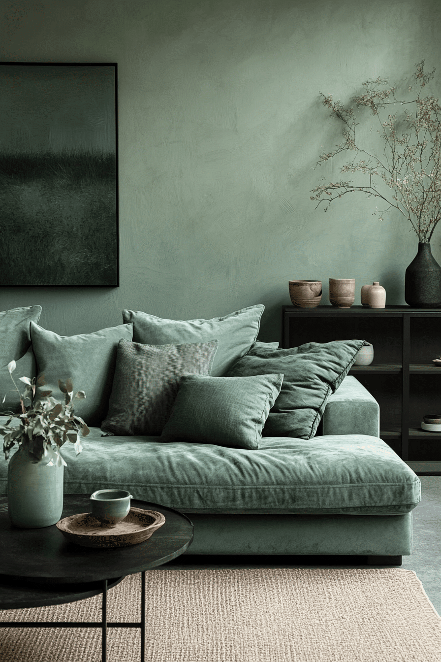 Balanced color can make a living room feel polished without losing its comfort. A sage green and grey living room feels especially refined when soft green upholstery or accents are paired with steady mid-tone grey and smooth finishes. Velvet pillows, brushed metallic touches, and clean wood furniture give the palette more depth without making it feel formal. Warm lighting from lamps and sconces keeps the room inviting from day to night. The final atmosphere feels graceful, grounded, and effortlessly current. Bring this sophisticated mix into your home and enjoy the upgrade.