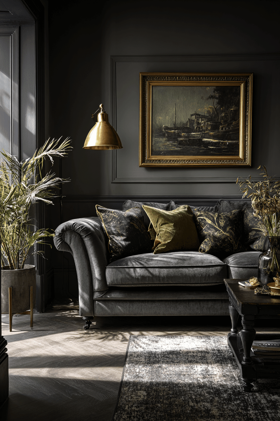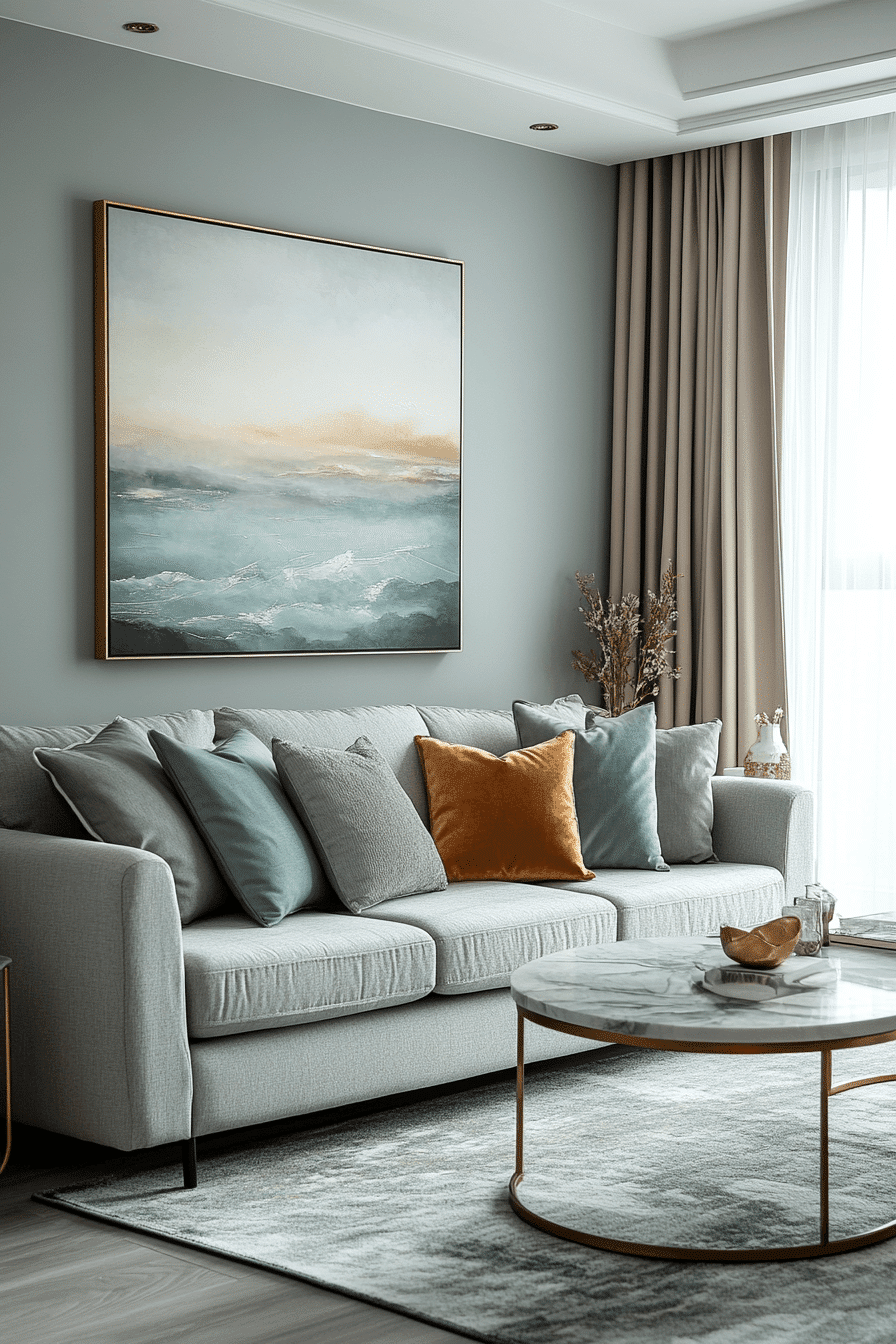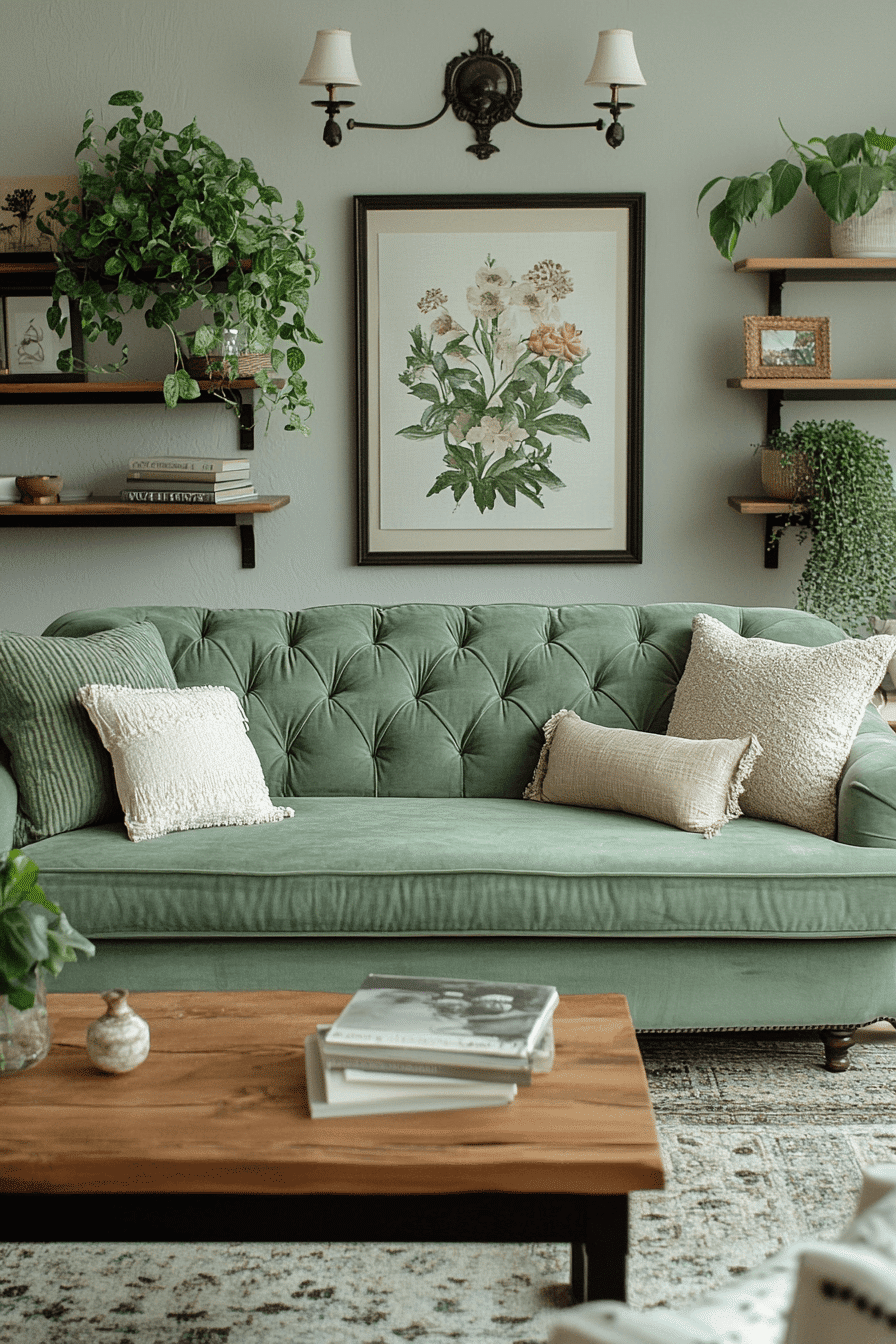 Balanced color can make a living room feel polished without losing its comfort. A sage green and grey living room feels especially refined when soft green upholstery or accents are paired with steady mid-tone grey and smooth finishes. Velvet pillows, brushed metallic touches, and clean wood furniture give the palette more depth without making it feel formal. Warm lighting from lamps and sconces keeps the room inviting from day to night. The final atmosphere feels graceful, grounded, and effortlessly current. Bring this sophisticated mix into your home and enjoy the upgrade.