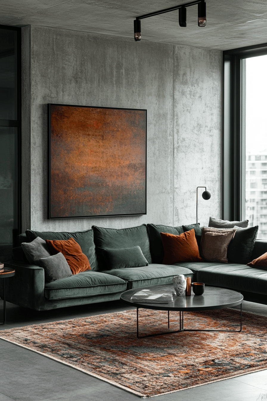 High contrast can make these soft tones feel much more dramatic and confident. A sage green and grey living room feels especially refined when charcoal walls or darker grey elements are paired with sage furnishings and layered tonal artwork. Stone, metal, and glass add sharpness that enhances the overall palette. Careful layering prevents the room from looking flat or severe. The final mood is bold, sophisticated, and still inviting. Try this stronger contrast and give your living area a more commanding style.
