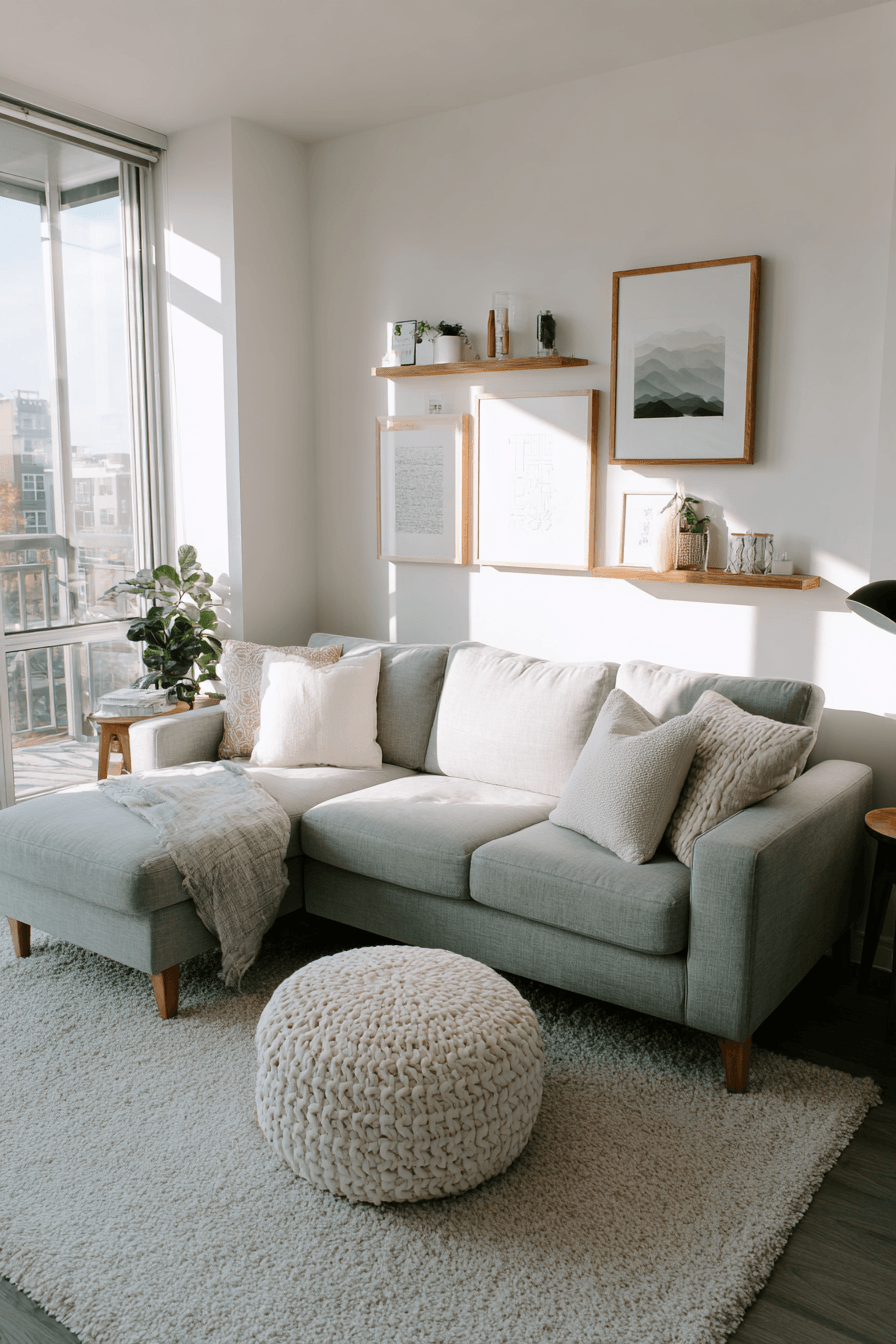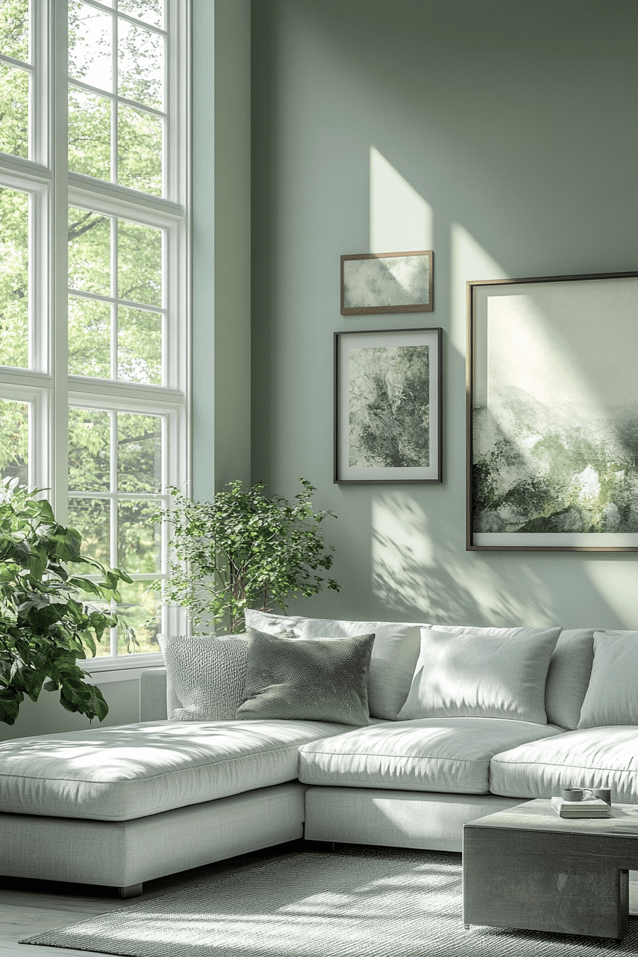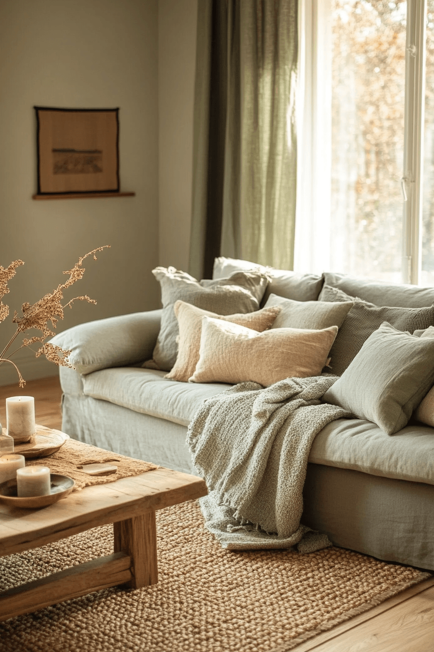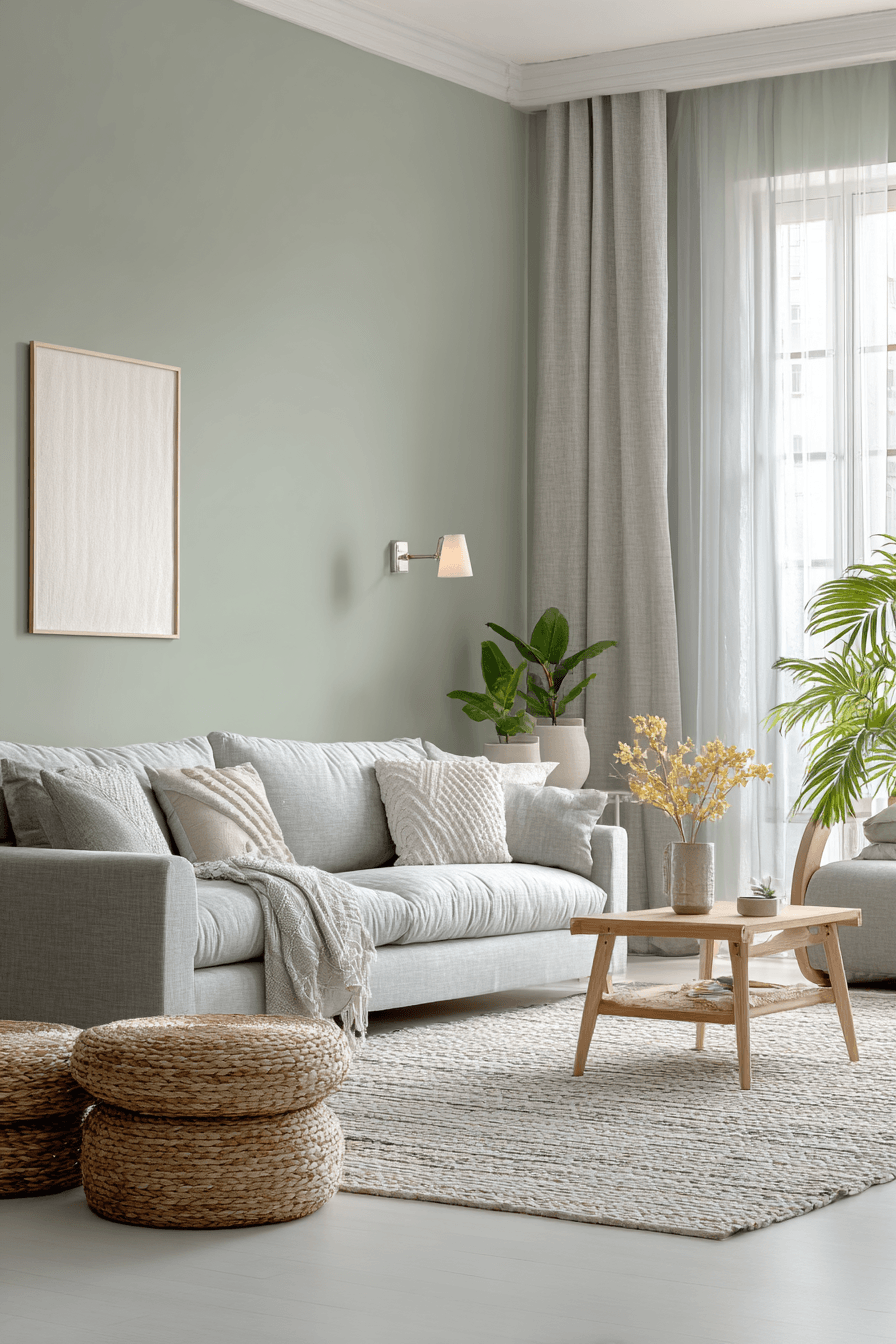 Lighter combinations can make the room feel airy, healthful, and easy to breathe in. A sage green and grey living room becomes especially calming when pale grey seating, off-white walls, and gentle green accents work together with natural textures. Linen, jute, and light wood add warmth without making the room feel dense. The space stays open, soft, and ideal for everyday comfort. It is a beautiful option for a home that values calm and clarity. Create this peaceful environment and enjoy the sense of ease it brings.