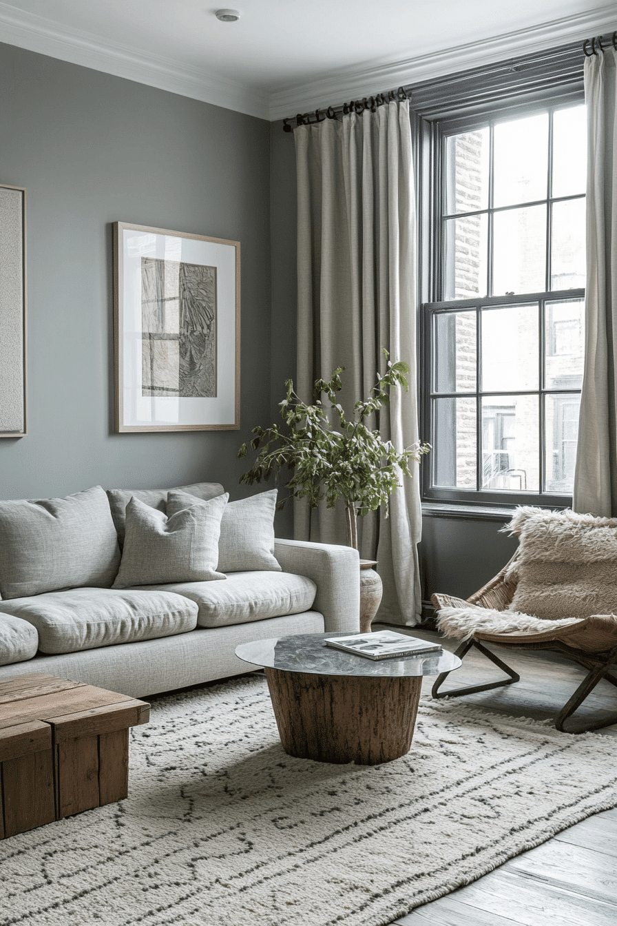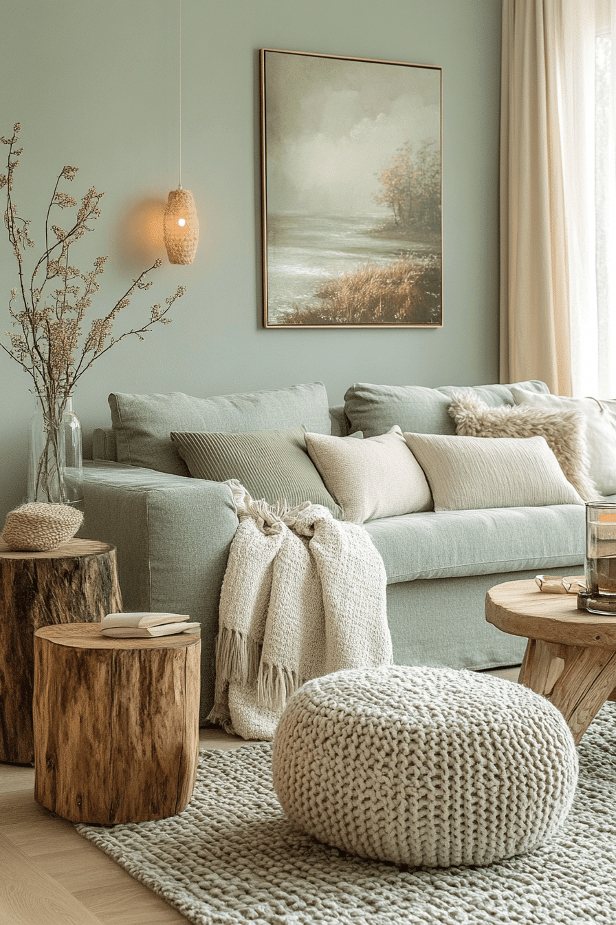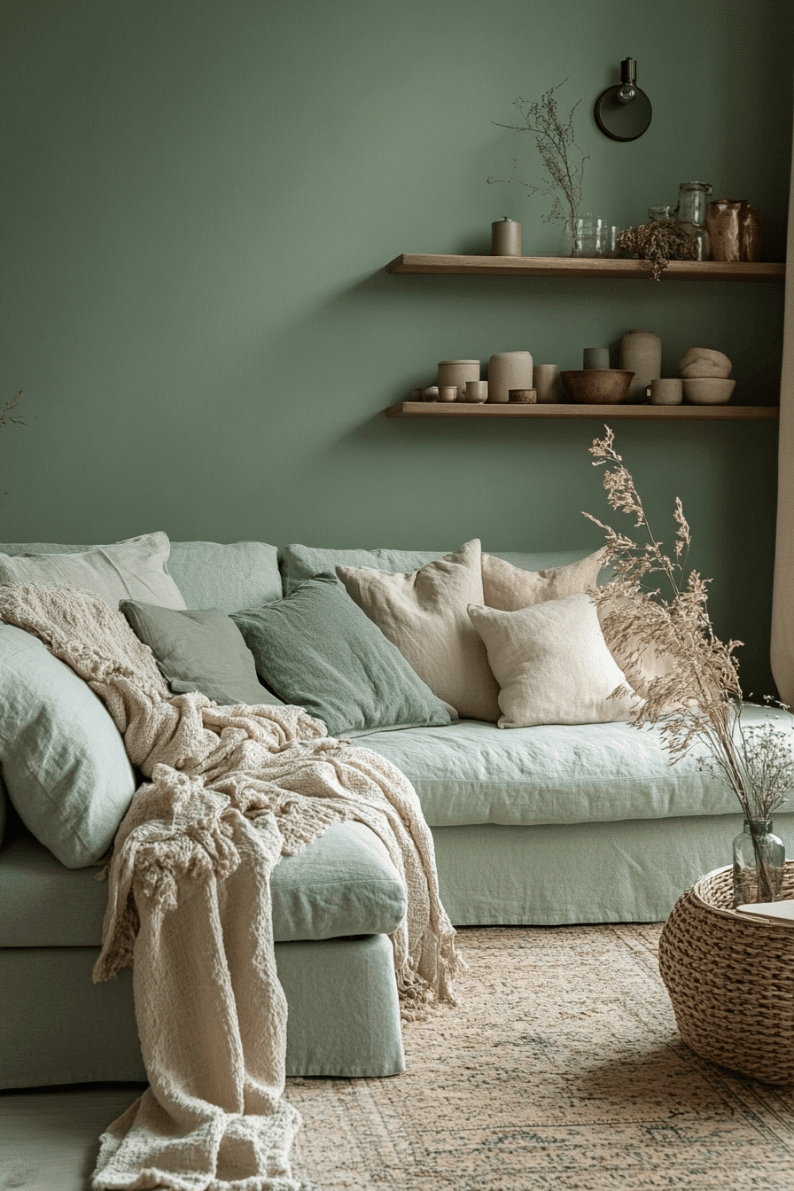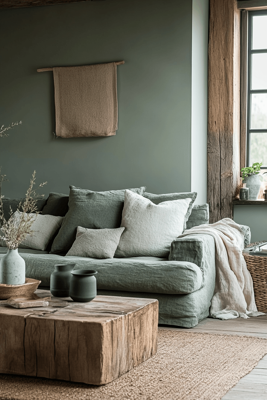 Nature-inspired styling can make these tones feel warmer and more rooted. A sage green and grey living room looks especially grounded when sage is mixed with warm grey, taupe, and organic textures throughout the space. Reclaimed wood, woven baskets, and handcrafted ceramics add tactile depth without pushing the room too rustic. The palette feels earthy but still modern and composed. The atmosphere becomes cozy, relaxed, and quietly beautiful. Bring this natural direction into your home and enjoy the warmth it adds.