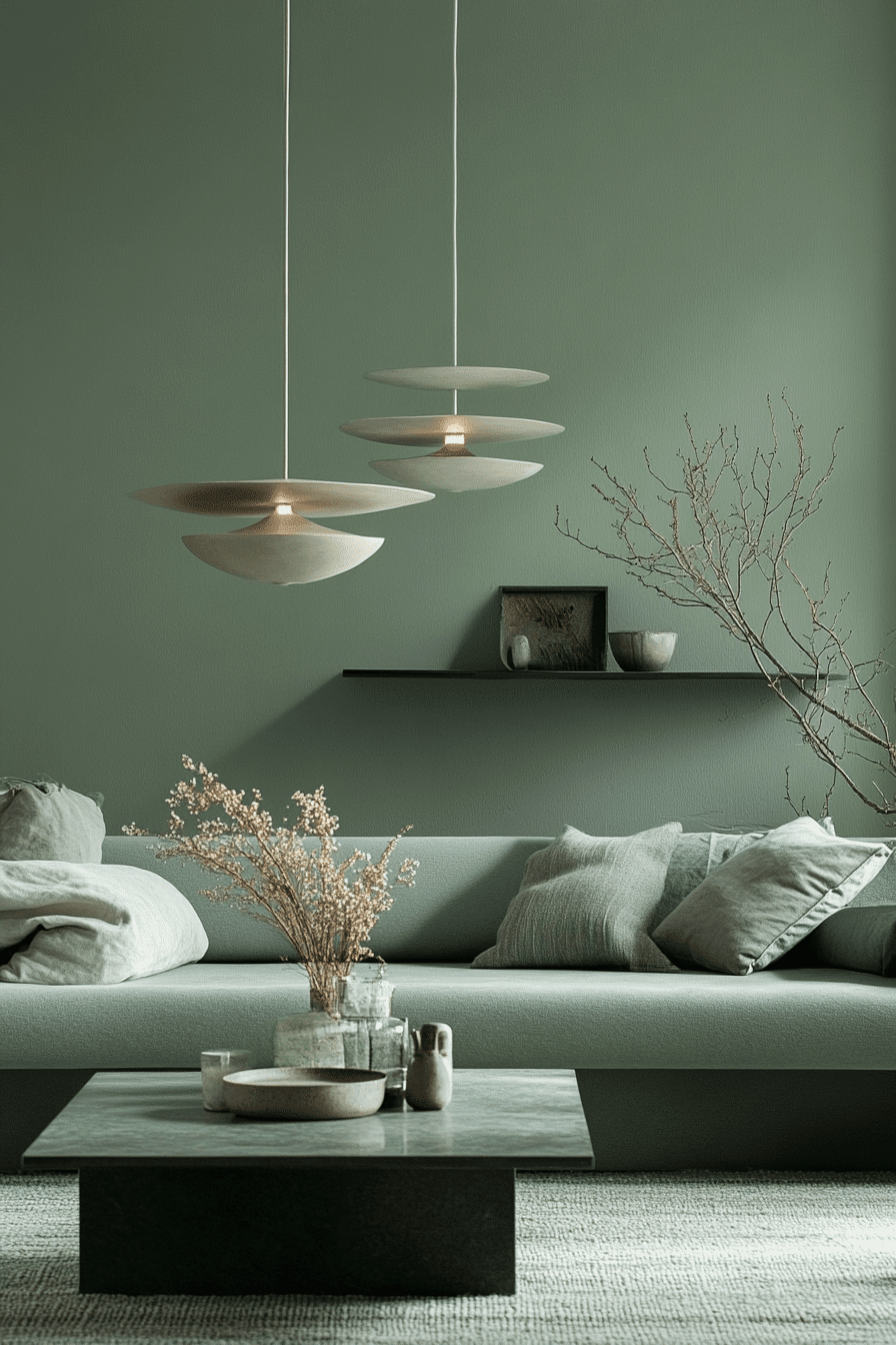 Architectural lines can make this palette feel strong, intentional, and beautifully modern. A sage green and grey living room looks especially crisp when streamlined seating, hidden storage, and a sage accent wall shape the room with simplicity. Geometric lighting and sculptural furniture add interest without distracting from the color balance. Minimal decor keeps the focus on form and proportion. The room feels elevated, clear, and thoughtfully arranged. Embrace this structured look and turn your living room into a modern refuge.