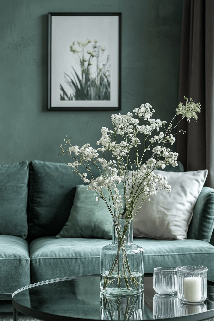 Elegant finishing touches can give this pairing a more graceful and versatile feel. A sage green and grey living room feels refined when soft grey walls, green furnishings, and layered lighting are joined by glass, metallic accents, or tactile fabrics. Each element adds depth without taking away from the calm palette. The room can lean minimalist or slightly elevated depending on the details you choose. The final mood is cohesive, polished, and softly luxurious. Discover this graceful combination and elevate your living room with ease.