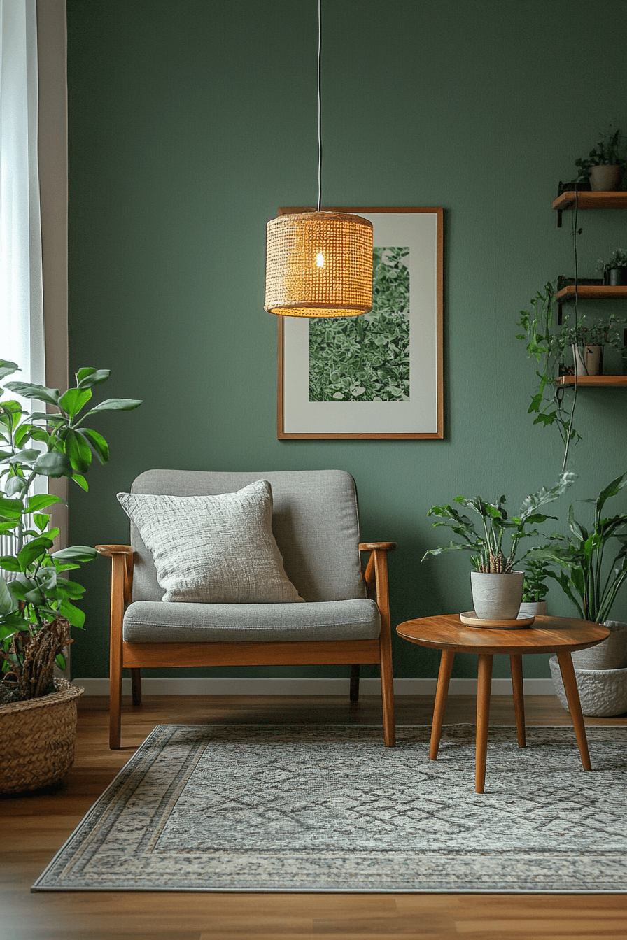 Mid-century forms can give this palette a little more personality without disturbing its calmness. A sage green and grey living room feels especially stylish when tapered-leg furniture, warm grey upholstery, and a soft green wall are combined with statement lighting. The muted colors soften the bolder shapes and keep the room cohesive. The result feels classic, current, and very approachable. It is a smart way to blend design history with modern comfort. Introduce this influence and give your room a timeless refresh.