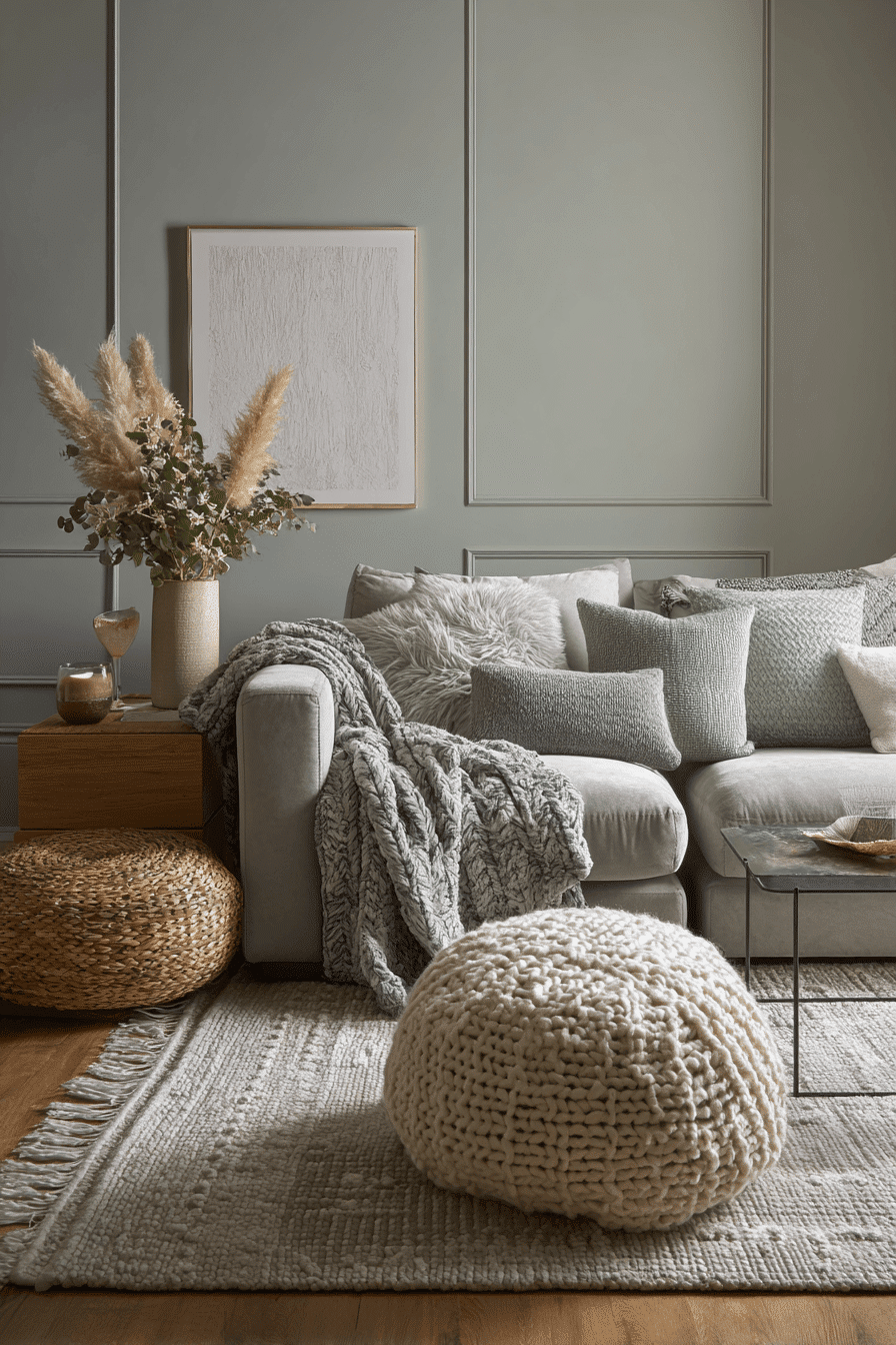 Material contrast can become the most interesting part of the room when the colors stay muted. A sage green and grey living room looks especially inviting when boucle, wool, cotton, and plush textures are layered together in soft green and grey. Sculptural decor or textured wall pieces add extra depth without overwhelming the space. The palette gives every material room to stand out. The room feels tactile, warm, and beautifully styled. Explore this texture-rich approach and elevate your living area with ease.
