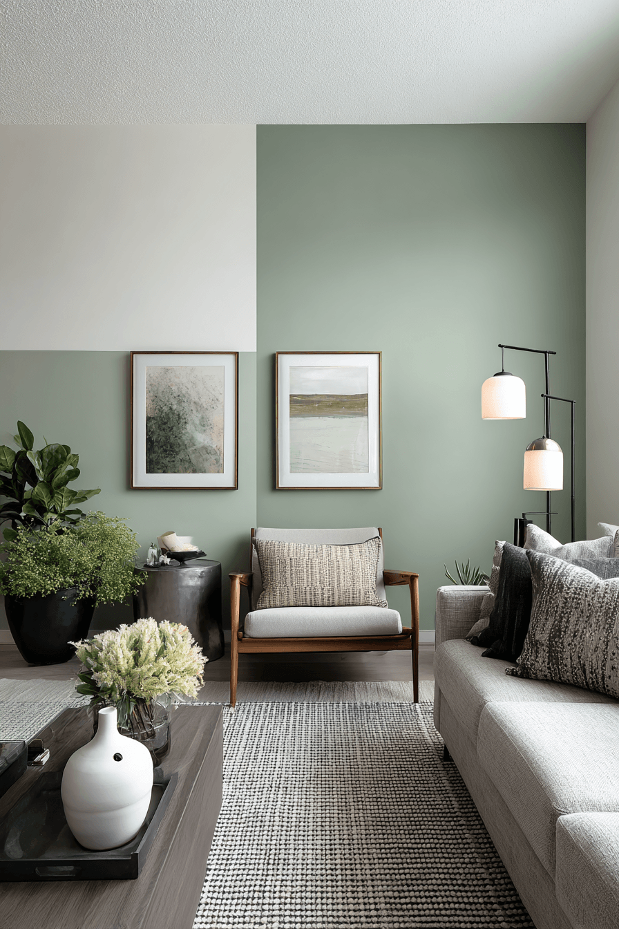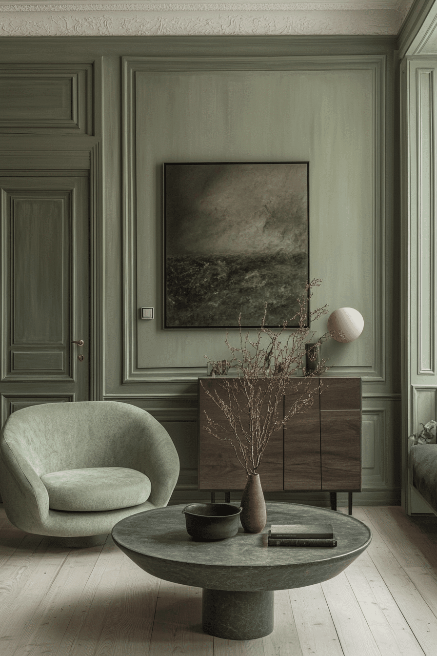 Contrast becomes more artistic when light and dark are balanced with care. A sage green and grey living room looks visually rich when pale sage seating is placed against deeper grey walls, or when a darker sofa is brightened by soft green surroundings. Minimal decor and reflective accents keep the room polished rather than busy. Layered light helps emphasize the shapes and tones throughout the space. The effect feels modern, balanced, and confidently styled. Bring this artistic contrast into your room and enjoy the transformation.