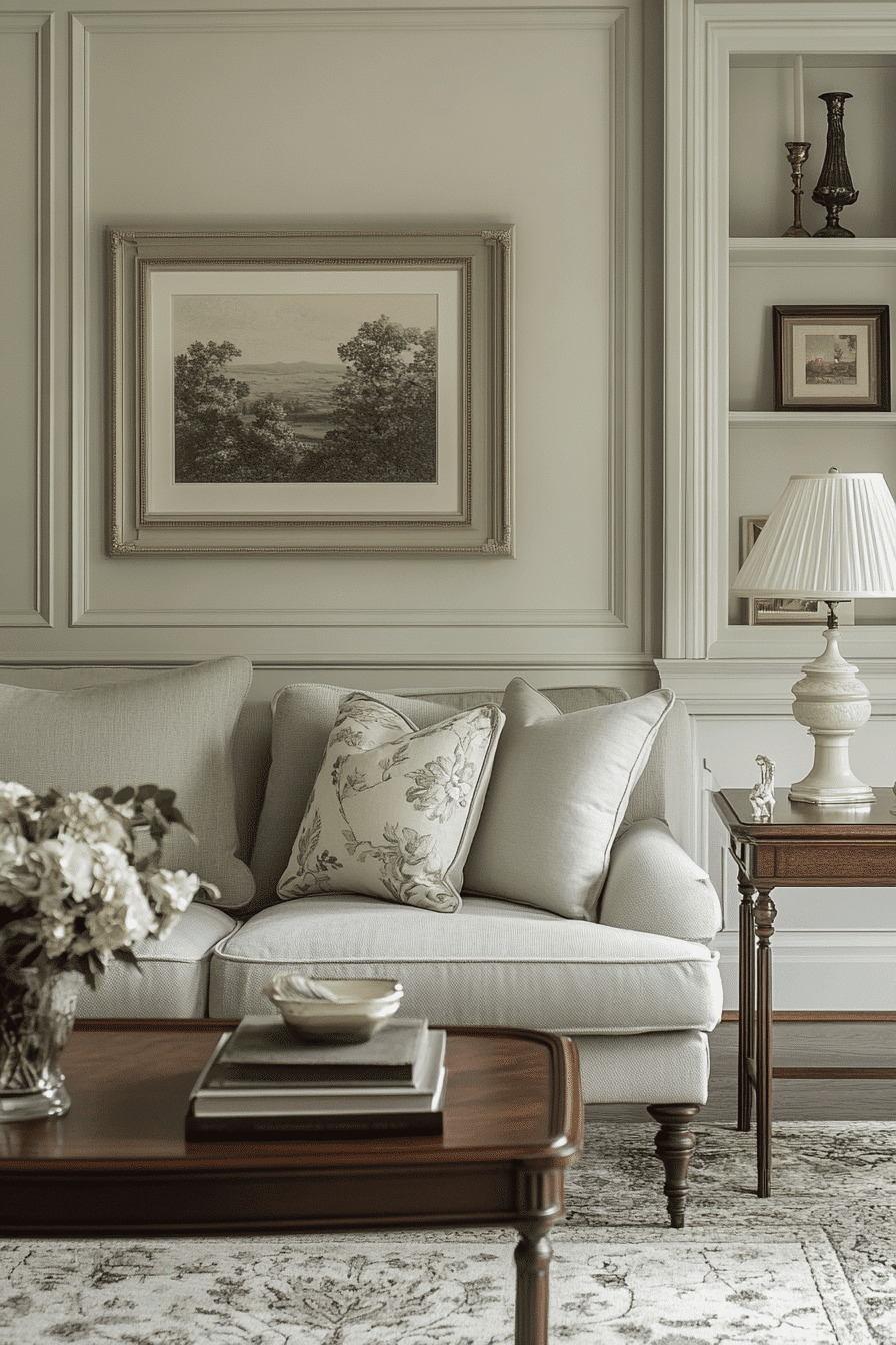 Classic proportions can help this palette feel enduring rather than trend-driven. A sage green and grey living room looks timeless when simple silhouettes, balanced layouts, and neutral supporting tones create an easy sense of order. A green sofa or wall paired with mid-grey textiles keeps the room harmonious without overcomplicating it. Framed art and symmetrical accents add quiet polish. The overall impression feels thoughtful, current, and built to last. Embrace this classic direction and refresh your living room with confidence.