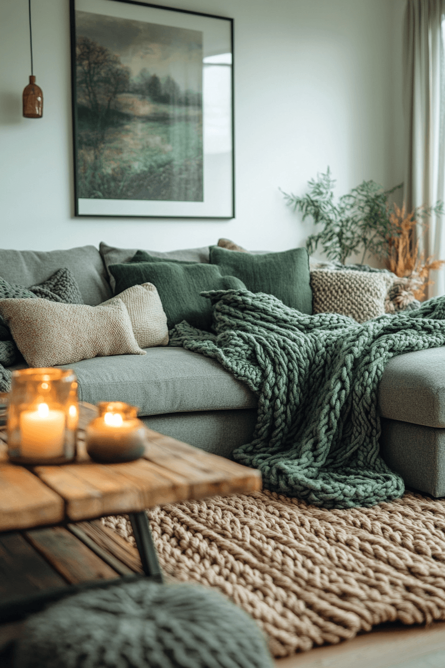 Scandinavian influence makes these shades feel especially fresh, simple, and comforting. A sage green and grey living room becomes effortlessly cozy when pale grey, soft sage, white walls, and natural wood are combined with quiet intention. Candles, throws, and layered textiles add warmth without cluttering the look. The final room feels airy but never empty. It is the kind of style that stays appealing through every season. Bring this Nordic mood into your home and enjoy its calm simplicity.