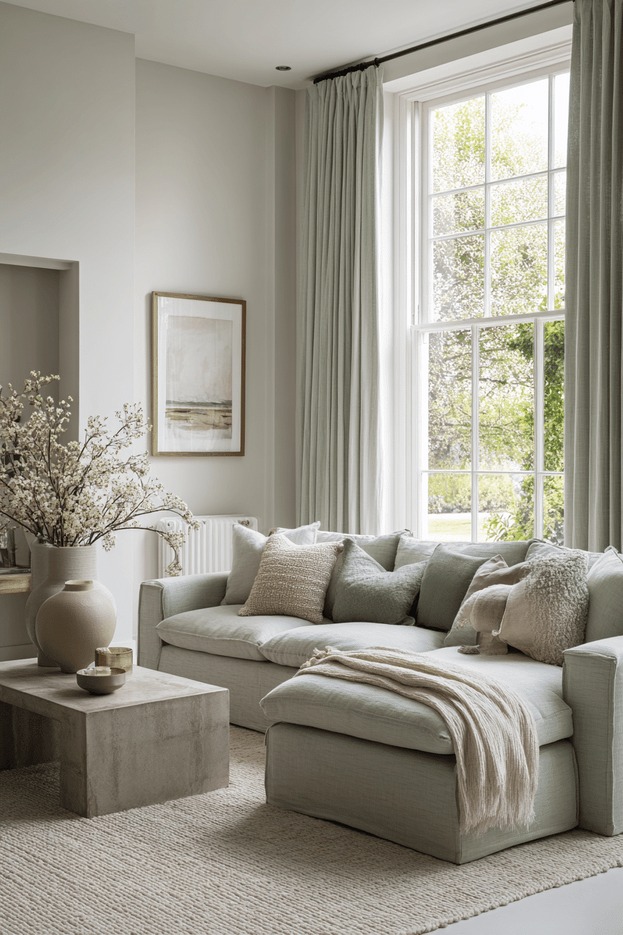 Softer muted shades can shift the whole room into a calmer, more restorative mood. A sage green and grey living room feels wonderfully soothing when dusty sage walls meet a plush grey sofa and gently coordinated drapery. Natural materials like linen, stone, and ceramic pieces deepen the relaxed feeling without taking attention away from the palette. A pale rug helps hold everything together in a subtle way. The space feels polished, peaceful, and deeply comfortable. Bring this quiet palette home and enjoy the softer atmosphere.