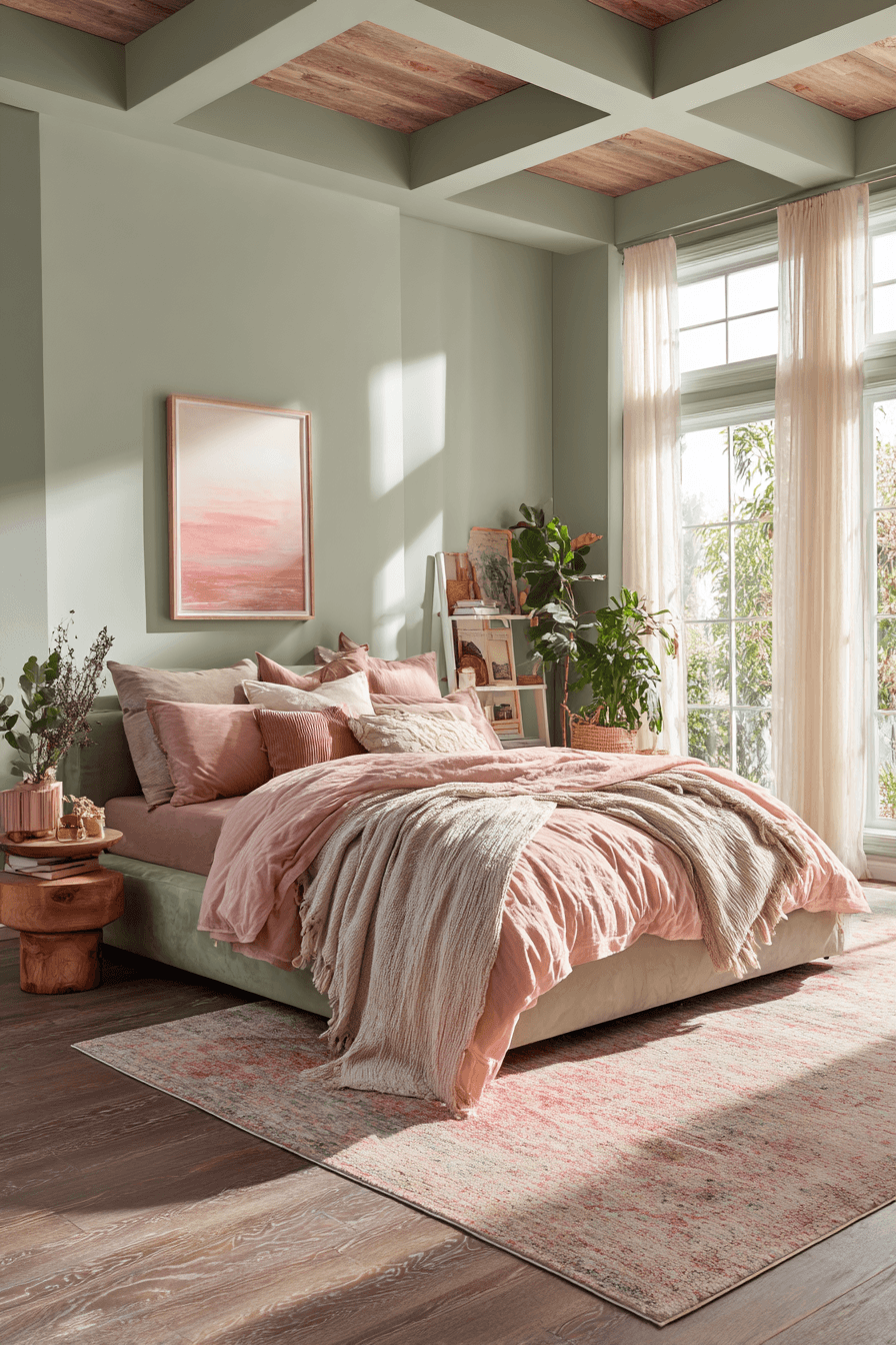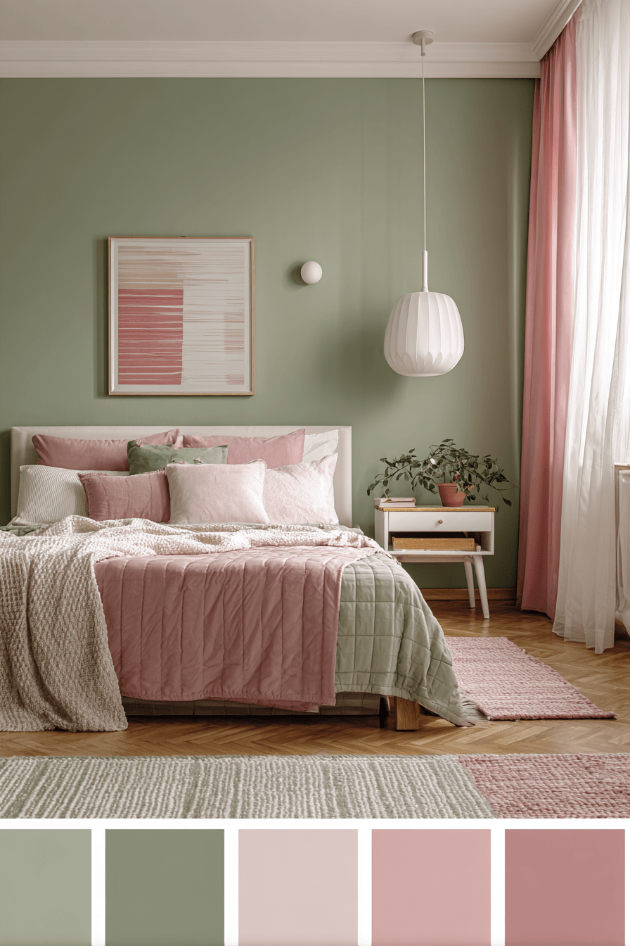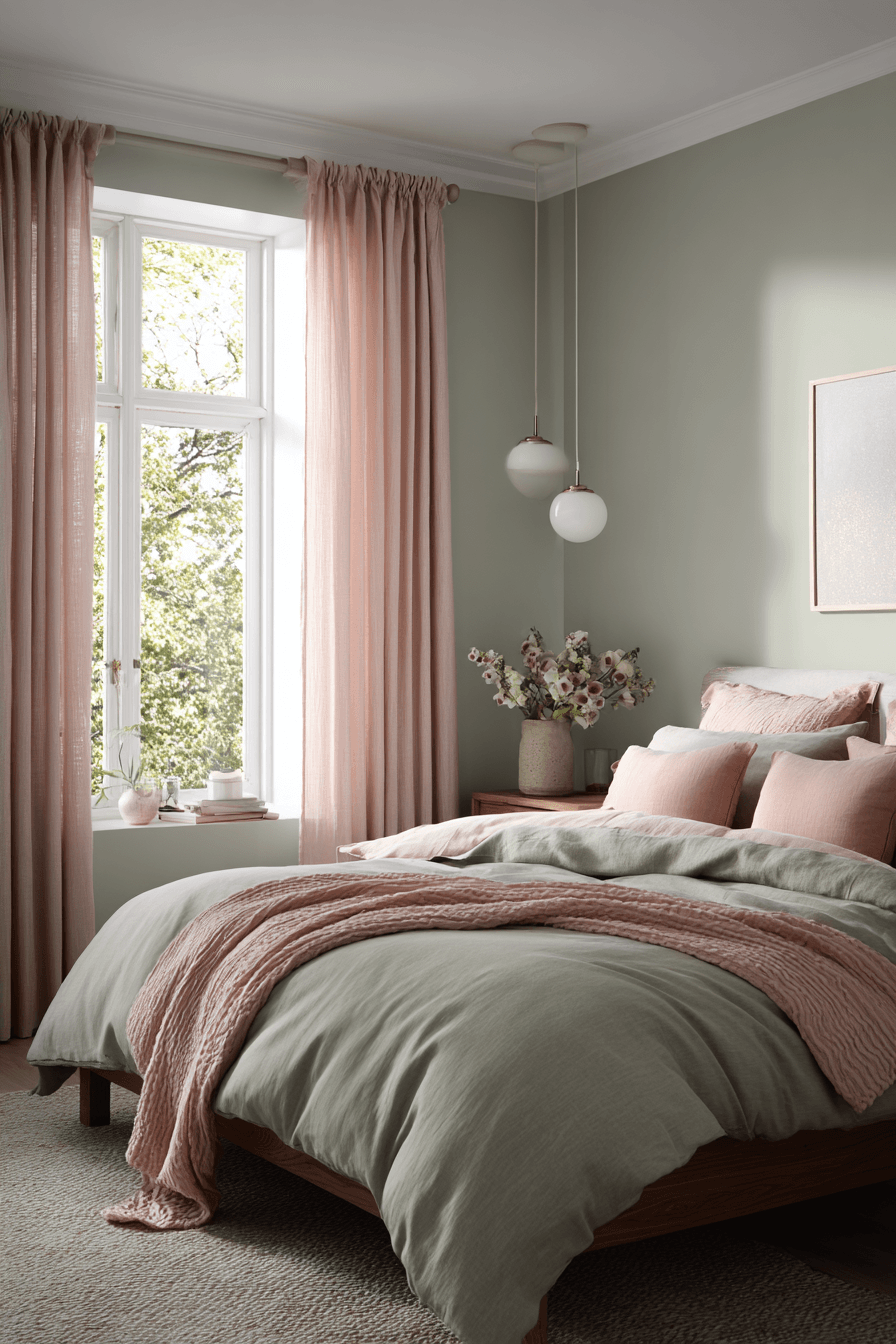 Equal color balance can make the room feel calm, complete, and beautifully coordinated. A sage green and pink bedroom looks especially harmonious when both shades appear consistently through bedding, curtains, decor, and accent details. White, beige, or pale wood helps ground the palette and keep it sophisticated. Each color plays a clear role in the overall design, which makes the room feel intentional. The final effect is welcoming, balanced, and easy to love. Create this coordinated look and enjoy a bedroom that feels perfectly finished.