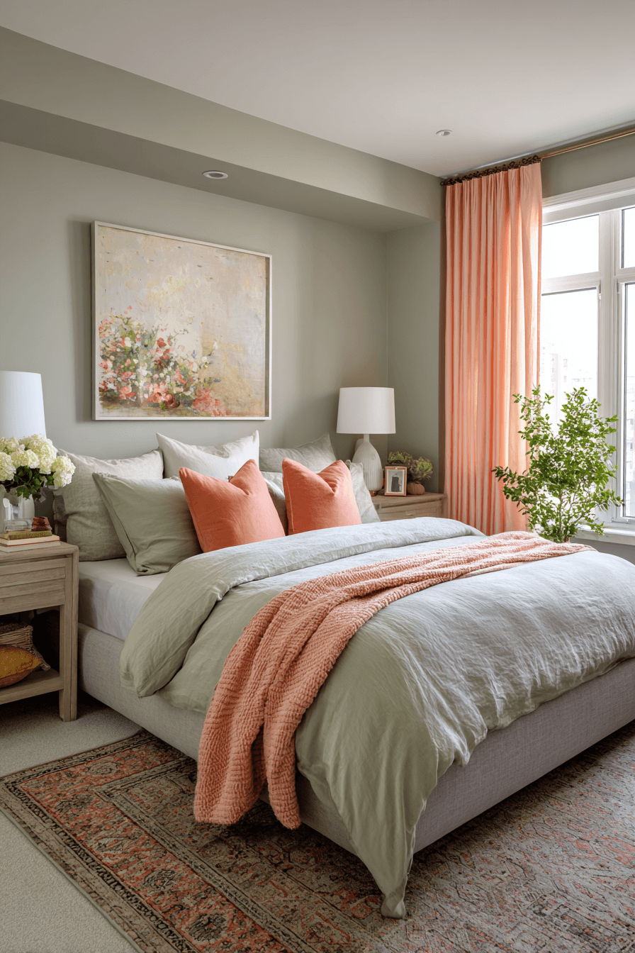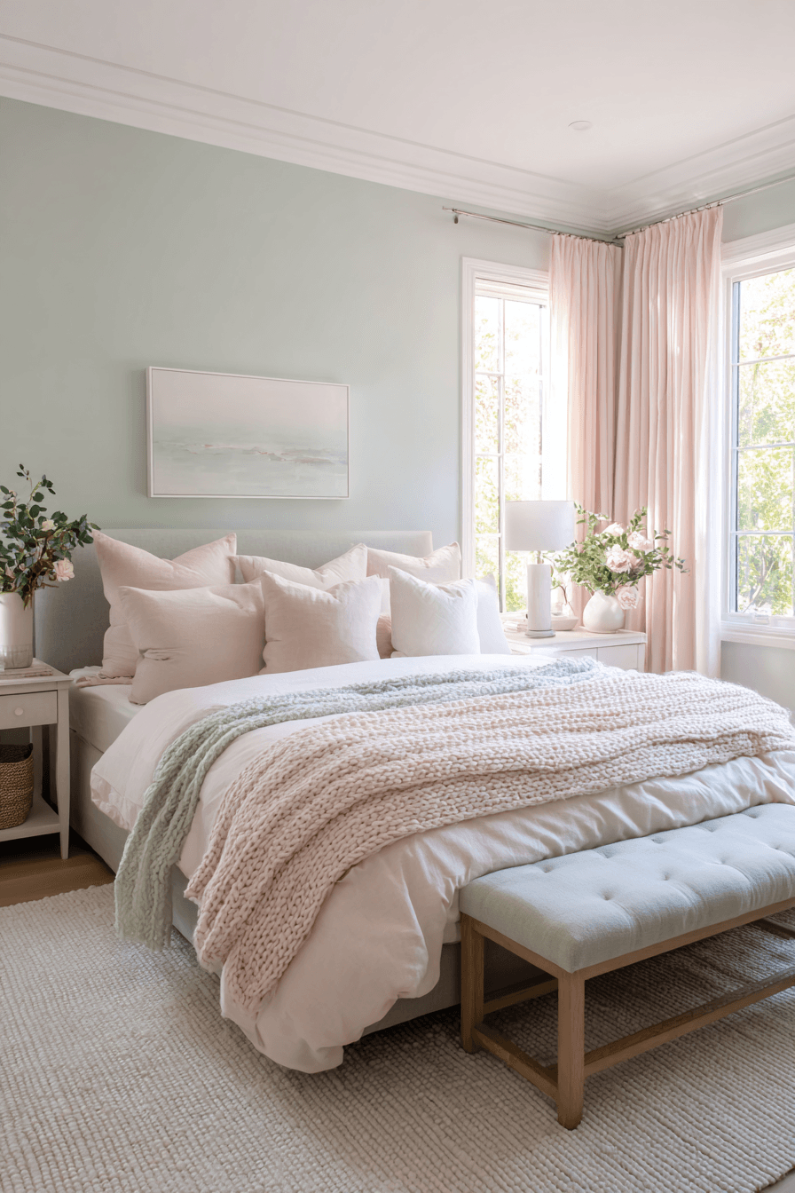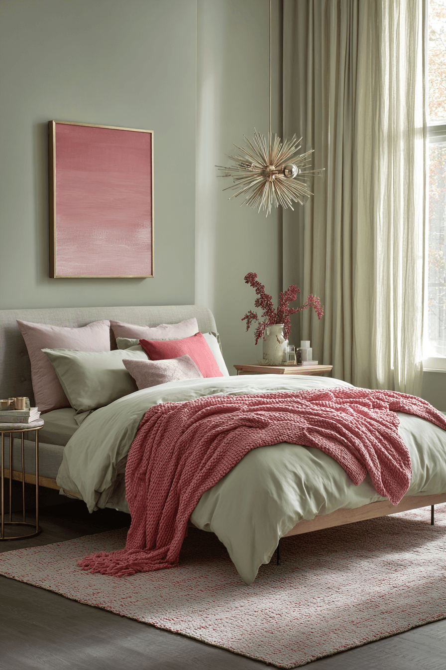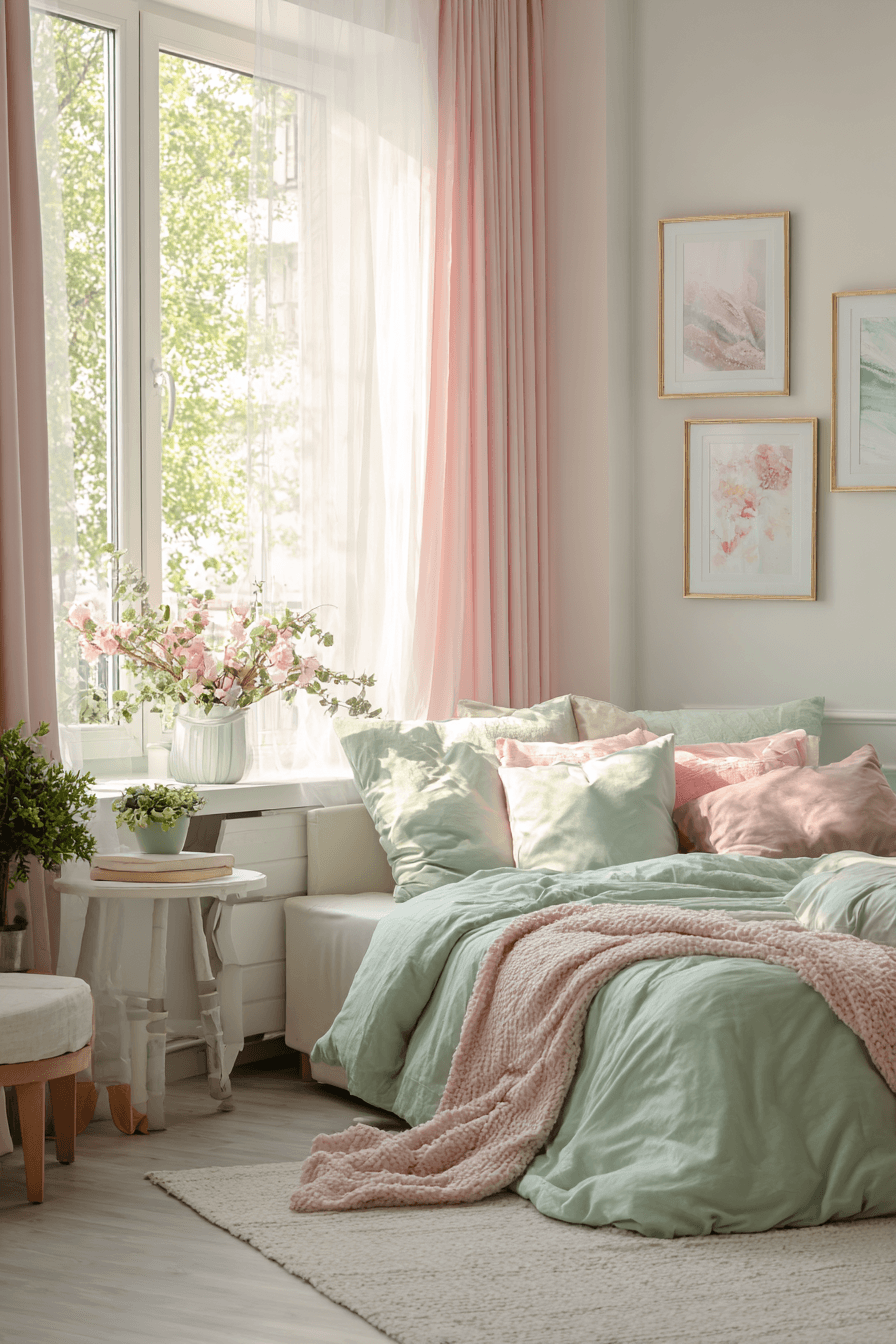 Equal color balance can make the room feel calm, complete, and beautifully coordinated. A sage green and pink bedroom looks especially harmonious when both shades appear consistently through bedding, curtains, decor, and accent details. White, beige, or pale wood helps ground the palette and keep it sophisticated. Each color plays a clear role in the overall design, which makes the room feel intentional. The final effect is welcoming, balanced, and easy to love. Create this coordinated look and enjoy a bedroom that feels perfectly finished.