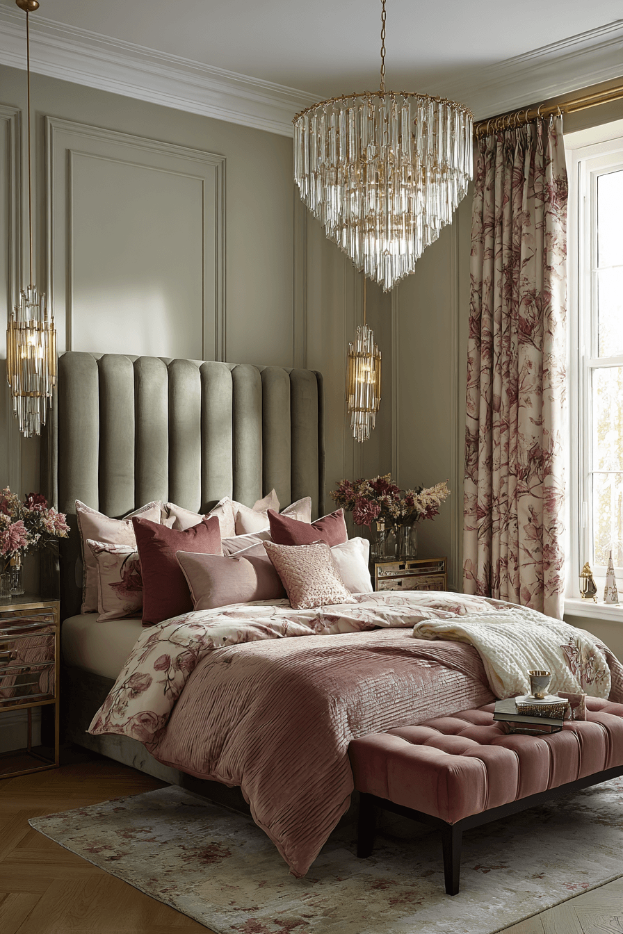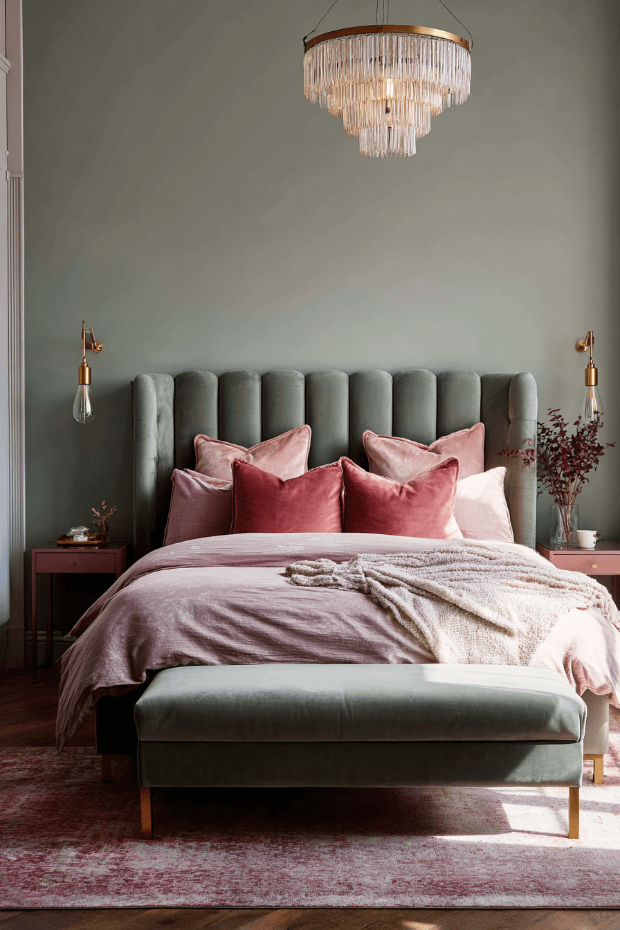 Rich texture can make soft color feel far more luxurious than expected. A sage green and pink bedroom becomes more elevated when deeper sage tones meet blush textiles, velvet surfaces, and subtle metallic finishes. The green adds grounded depth while the pink keeps the room light and welcoming. Layered fabrics bring dimension that helps every corner feel more intentional. The finished look feels refined, calm, and softly upscale. Introduce these luxe details into your bedroom and enjoy the transformation.