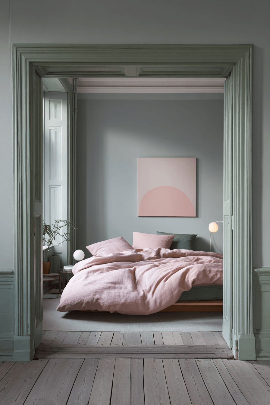 Minimal rooms can still feel warm when the palette itself carries the softness. A sage green and pink bedroom feels especially chic when pale green walls, blush bedding, and simple furniture are styled with lots of open space. The colors add just enough warmth to keep the room from feeling flat or stark. Symmetry and clean lines give the design a more composed finish. Everything looks quiet, fresh, and very intentional. Embrace this minimalist approach and enjoy a beautifully simplified room.