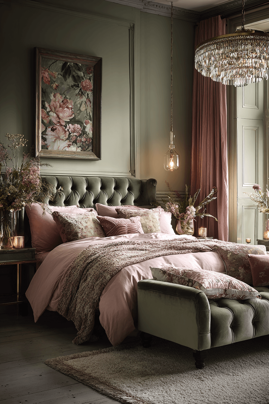 Rosy accents can add a graceful finish when paired with the right textures and tones. A sage green and pink bedroom feels especially elegant when green walls or bedding are layered with soft pink fabrics, subtle gold accents, and smooth finishes. Velvet or silk-like materials help the room feel more polished while keeping the softness intact. Minimal patterns allow the colors and textures to stay at the center of attention. The overall atmosphere feels elevated, feminine, and timeless. Add this rosy elegance to your room and enjoy the upgrade.