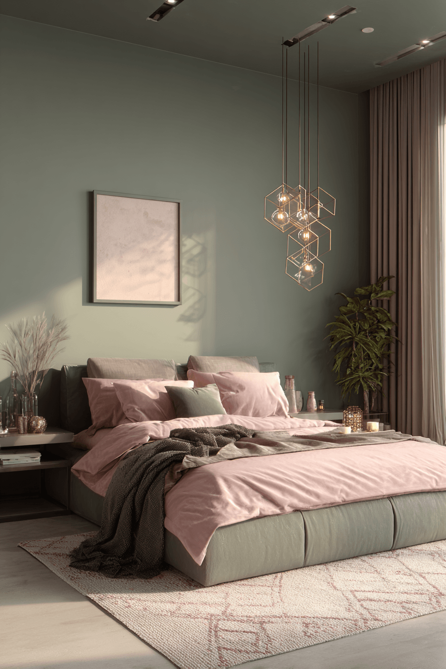 Contemporary shapes can make this palette feel especially fresh and livable. A sage green and pink bedroom looks modern when light green walls are paired with blush bedding, sculptural lamps, and furniture with simple lines. Minimal styling allows the colors to lead the room without distraction. The soft pink brings comfort, and the sage keeps the space feeling current and balanced. The overall effect is stylish, calm, and beautifully updated. Try this modern approach and enjoy a bedroom that feels renewed.