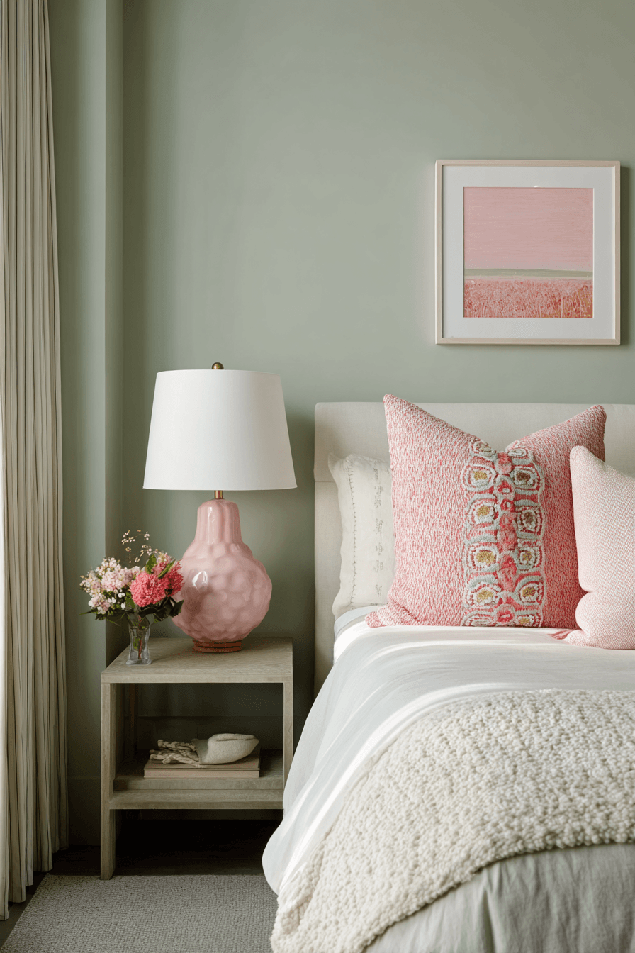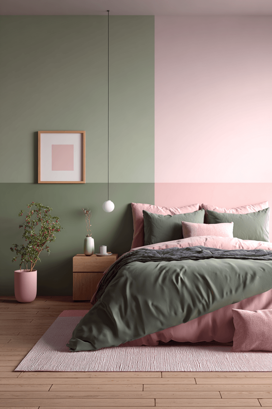 Split color placement can make this palette feel a little more daring and design-led. A sage green and pink bedroom becomes especially striking when sage and blush are divided across the walls and then echoed through textiles and smaller accessories. Neutral furniture allows the colors to remain the main feature without causing visual clutter. The look feels modern, confident, and thoughtfully styled. It is a strong option for anyone who wants more personality in the space. Try this two-tone idea and make your bedroom stand out beautifully.