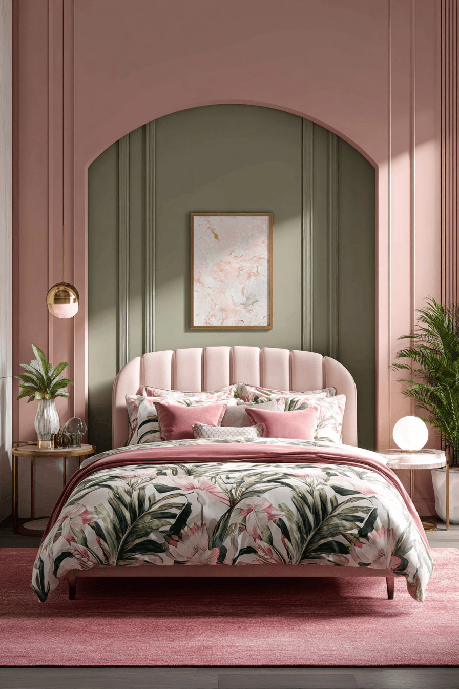 Nature-inspired detail can make this pairing feel fresher and more layered. A sage green and pink bedroom takes on a lovely botanical mood when soft floral or leafy patterns blend both tones across wallpaper, bedding, or accent fabrics. Clean furniture keeps the space modern and prevents the prints from feeling busy. A hint of matte black or warm metallic trim adds a more finished edge. The room feels natural, polished, and softly expressive. Bring this botanical direction into your room and enjoy the gentle update.