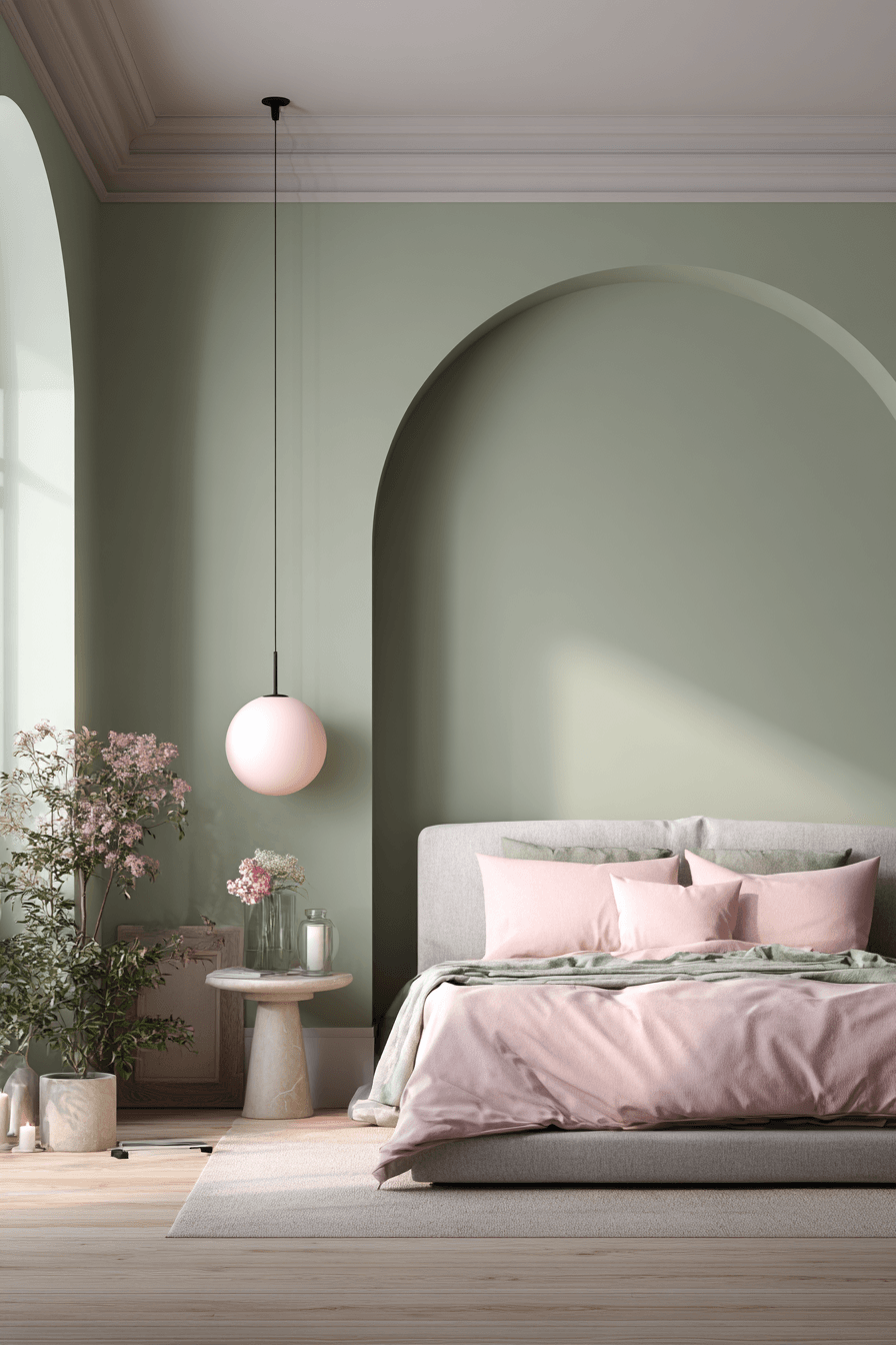 Color balance can completely change how polished a room feels. A sage green and pink bedroom looks especially harmonious when the two shades are used with intention across walls, furniture, and textiles. Sage can anchor the room through paneling or an upholstered bed, while blush adds softness through curtains, cushions, or smaller furnishings. Light flooring and pale trim keep the whole palette open and fresh. The room feels cohesive, elegant, and very easy to live with. Use this balanced approach and refresh your bedroom beautifully.