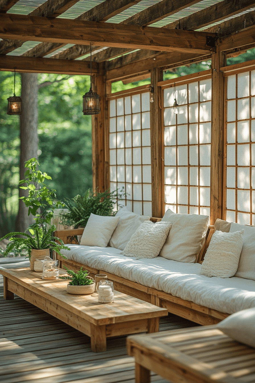 This porch captures the soul of a Scandinavian Japanese interior — open, warm, and connected to nature. Shoji-style screens filter sunlight into a soft, dreamy glow. Natural textures, pale tones, and light wood make the space calm and balanced. It’s a gentle embrace between indoors and outdoors.