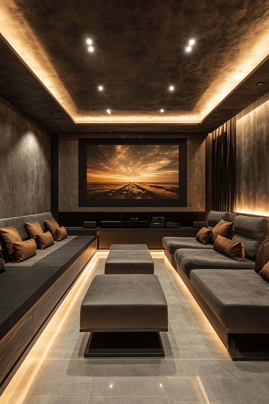 A Scandinavian Japanese interior media room blends modern comfort with serene sophistication. Neutral furniture, soft textures, and sleek design make relaxation feel effortless. Technology integrates seamlessly without overpowering the calm aesthetic. The space feels balanced, elegant, and cozy all at once.
