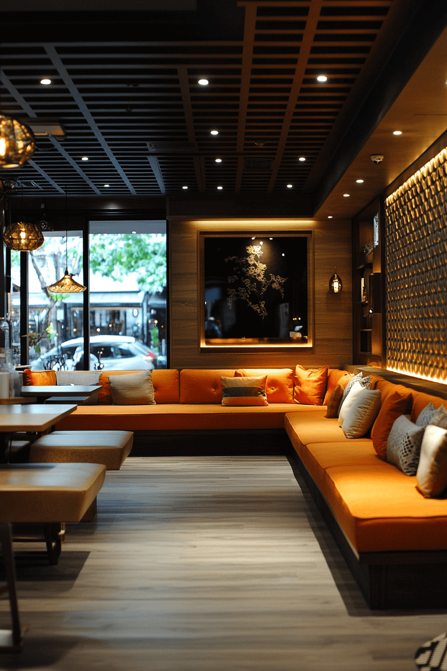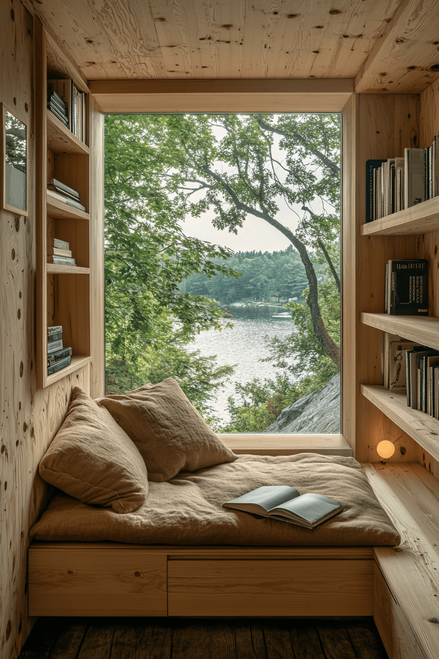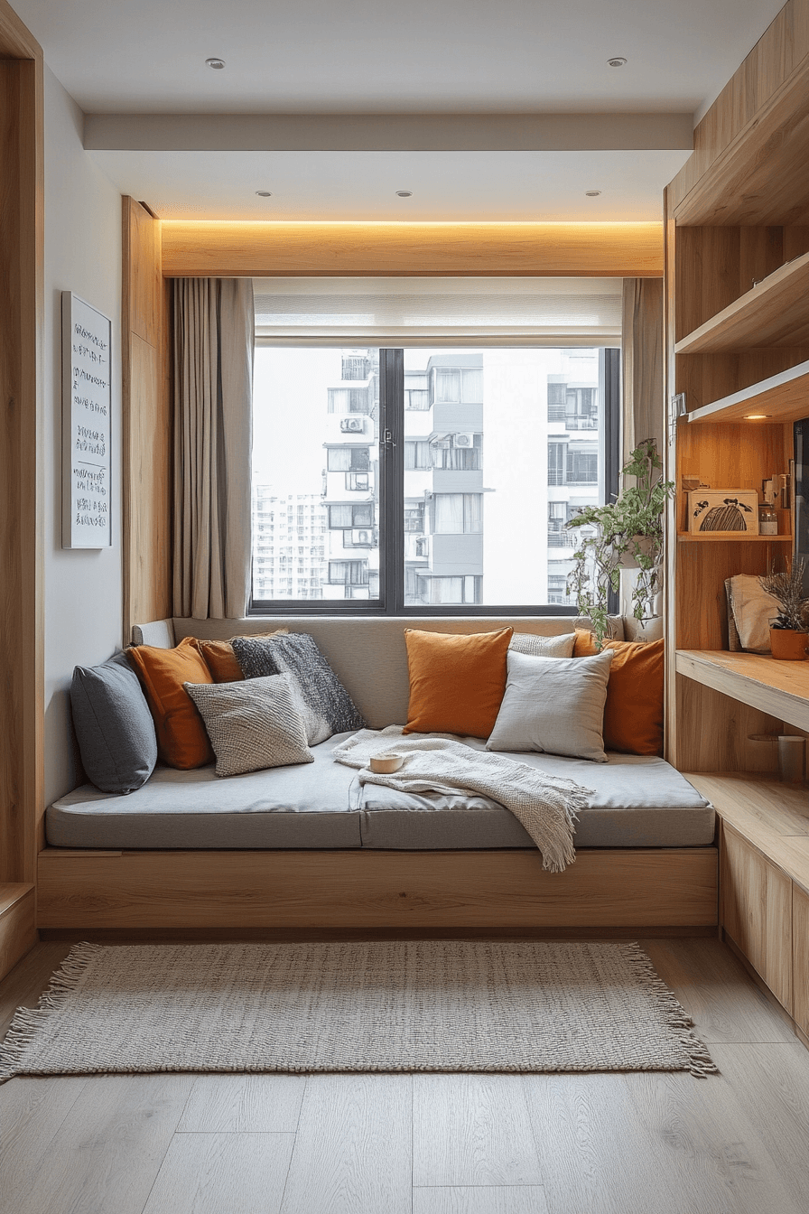 A Scandinavian Japanese interior reading nook feels like a warm, quiet embrace. Floor cushions, linen throws, and low shelves make every moment of rest deeply soothing. The lighting glows gently, encouraging calm focus. It’s minimal, inviting, and filled with heart.