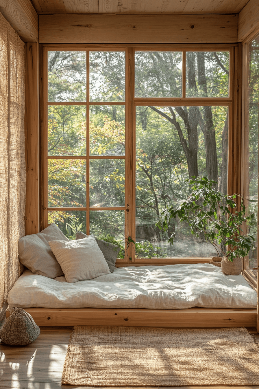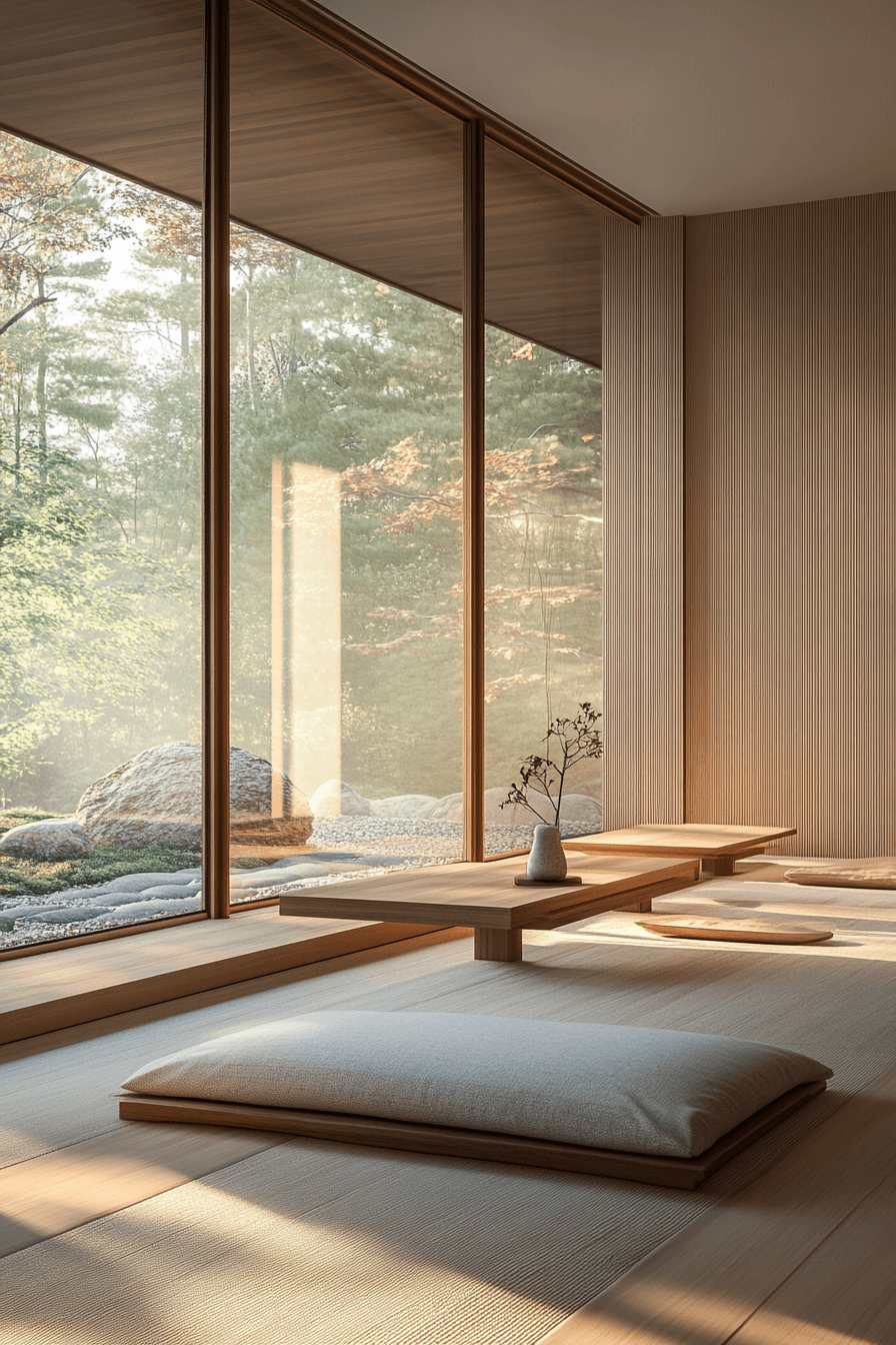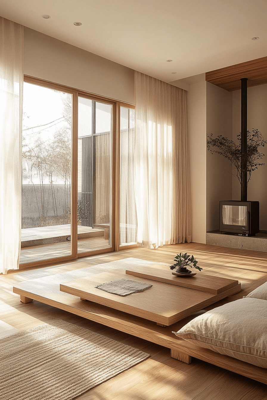 Morning light floods this Scandinavian Japanese interior sunroom with warmth and positivity. Pale wood tones and flowing fabrics create a glow that feels both energizing and calm. Minimal furnishings keep focus on the natural beauty outside. It’s your perfect retreat for reflection and renewal.