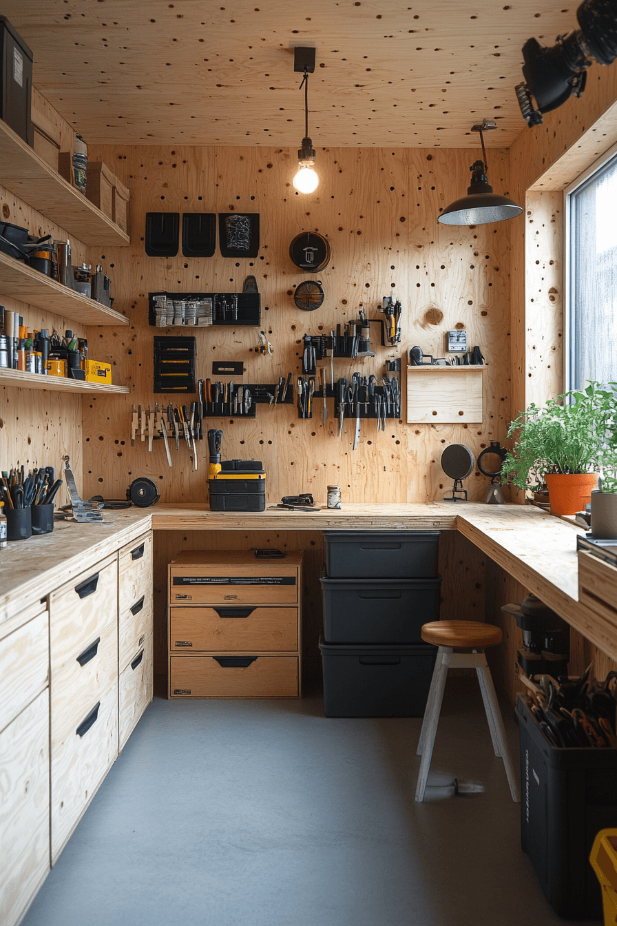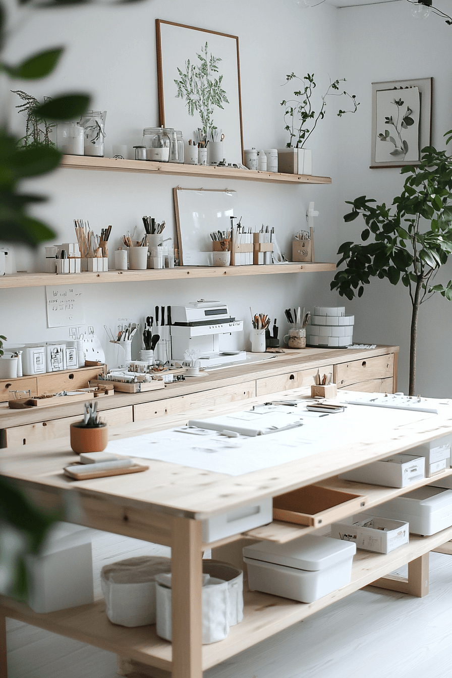 Creativity and peace merge perfectly in this Scandinavian Japanese interior craft room. Clean lines, smooth surfaces, and natural lighting enhance focus and flow. Every element sparks inspiration while keeping clutter hidden. It’s calm, functional, and filled with light.