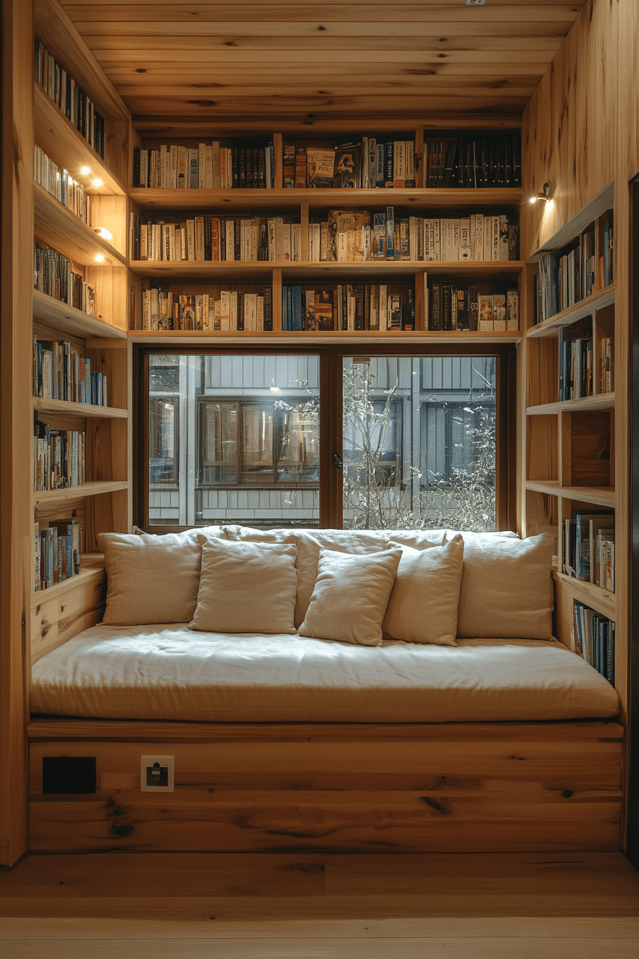 This library captures the peaceful union of Nordic coziness and Japanese restraint through Scandinavian Japanese interior design. Light shelves, soft fabrics, and natural light make every page-turn an experience in stillness. The space feels open yet deeply comforting. It’s where silence becomes luxury.