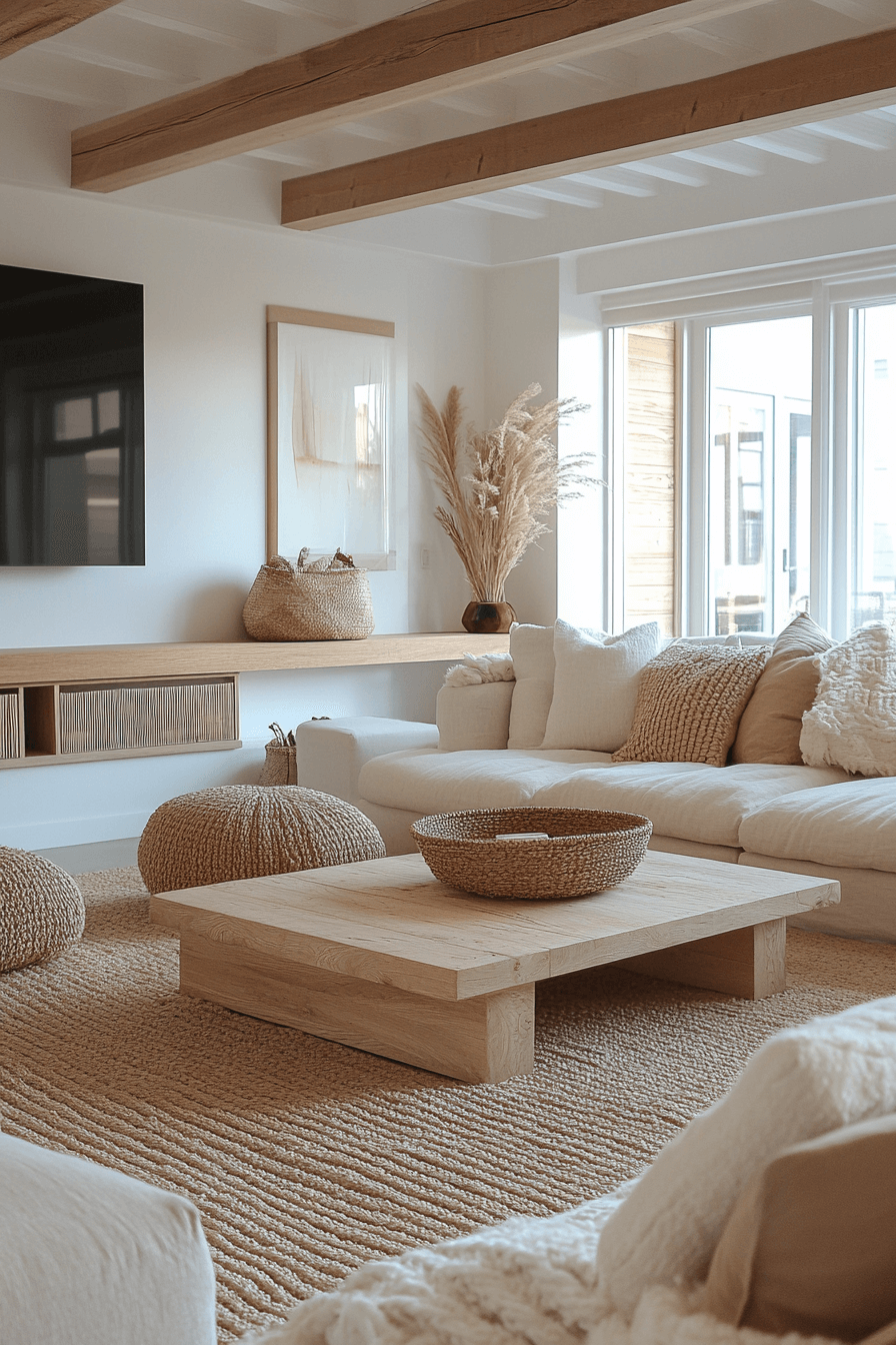 Calm meets comfort in this Scandinavian Japanese interior living room made for slow mornings and cozy evenings. The space embraces balance through warm wood, organic fabrics, and thoughtful design. Minimal furniture keeps it open and free, while soft light wraps every corner in peace. It’s a room that feels like an exhale.