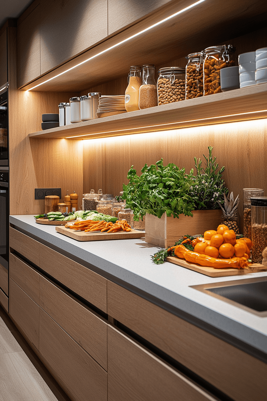 Organization becomes an art form in this Scandinavian Japanese interior pantry. Natural wood shelving, smooth finishes, and subtle lighting make storage feel serene. The clean layout highlights balance and order. Every jar and bowl feels intentional.