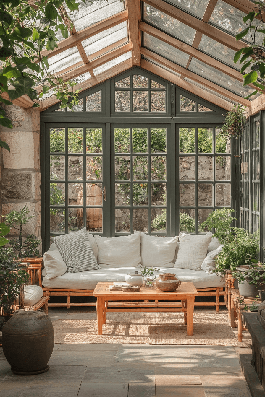 A conservatory bathed in light celebrates nature’s beauty through Scandinavian Japanese interior harmony. Soft furnishings, pale woods, and leafy plants create a space of still joy. Sunlight filters gently, warming every surface. The space feels timeless and balanced.