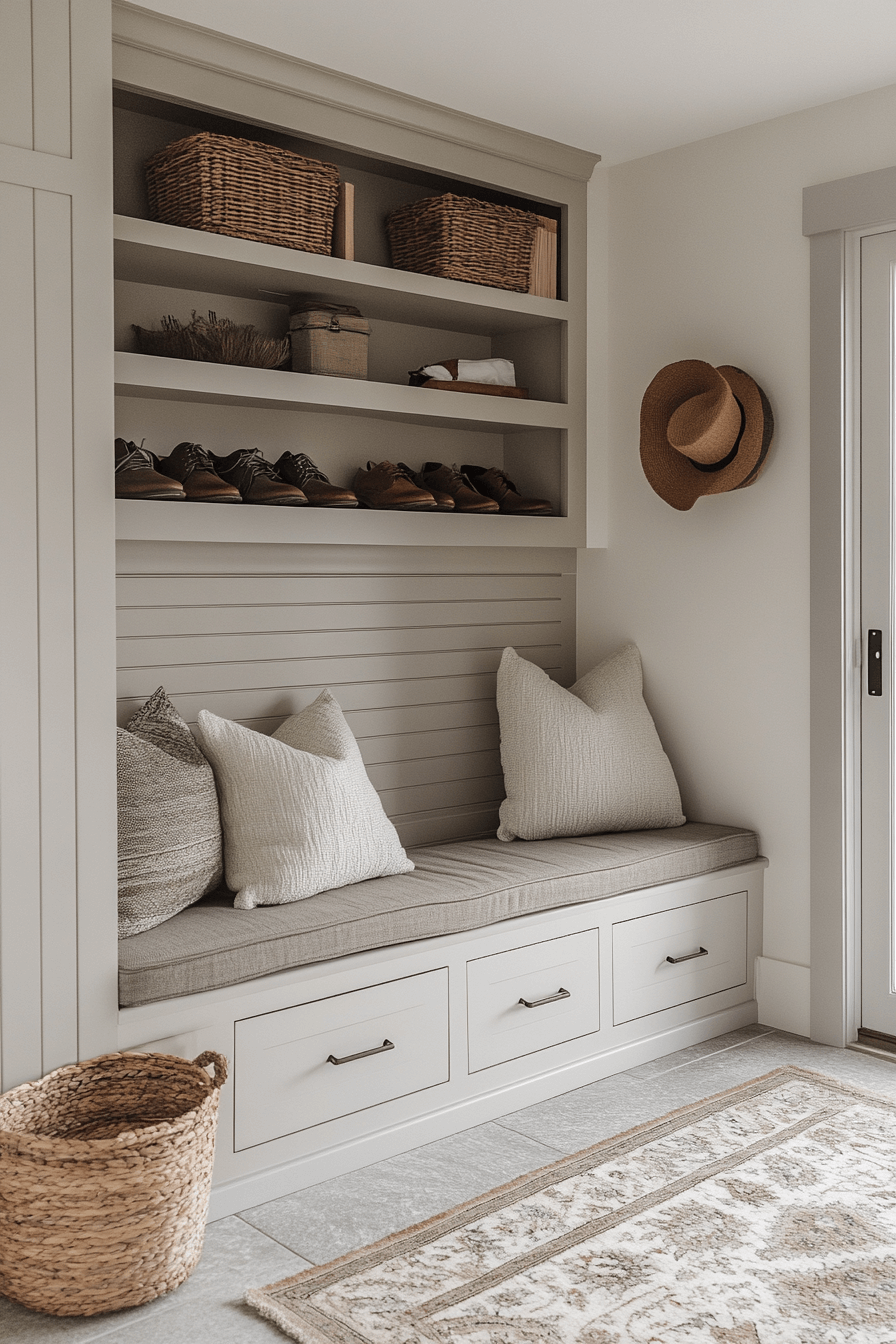 Simplicity shines in this mudroom designed with Scandinavian Japanese interior grace. Sleek hooks, natural benches, and airy tones create order without effort. The space feels light, refreshing, and full of flow. It’s the perfect blend of beauty and purpose.