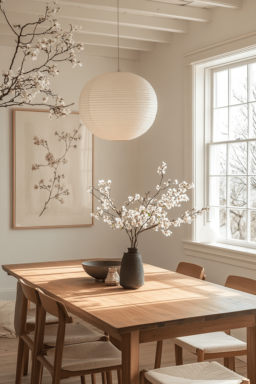 A dining area inspired by Scandinavian Japanese interiors captures both joy and tranquility. Soft hues, curved chairs, and natural wood invite conversation and calm connection. Gentle sunlight reflects off minimalist textures, giving each meal a sense of warmth. It’s simple, elegant, and endlessly soothing.