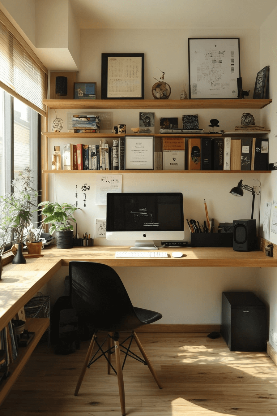 Designed for focus and inner calm, this Scandinavian Japanese interior office turns work into a peaceful ritual. Clean lines and a neutral palette create clarity, while natural light inspires productivity without stress. Everything has purpose—from the simple desk to the mindful décor. It’s a workspace that feels balanced and bright.