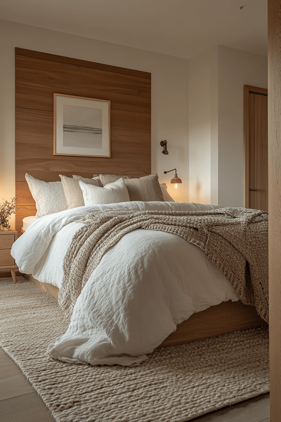 This bedroom embraces the heart of Scandinavian Japanese interior design — restful, warm, and effortlessly elegant. Smooth wood, soft linen, and ambient lighting create a cocoon of calm. Every detail feels intentional, inviting you to relax deeply. The atmosphere is cozy yet minimal, luxurious yet simple.