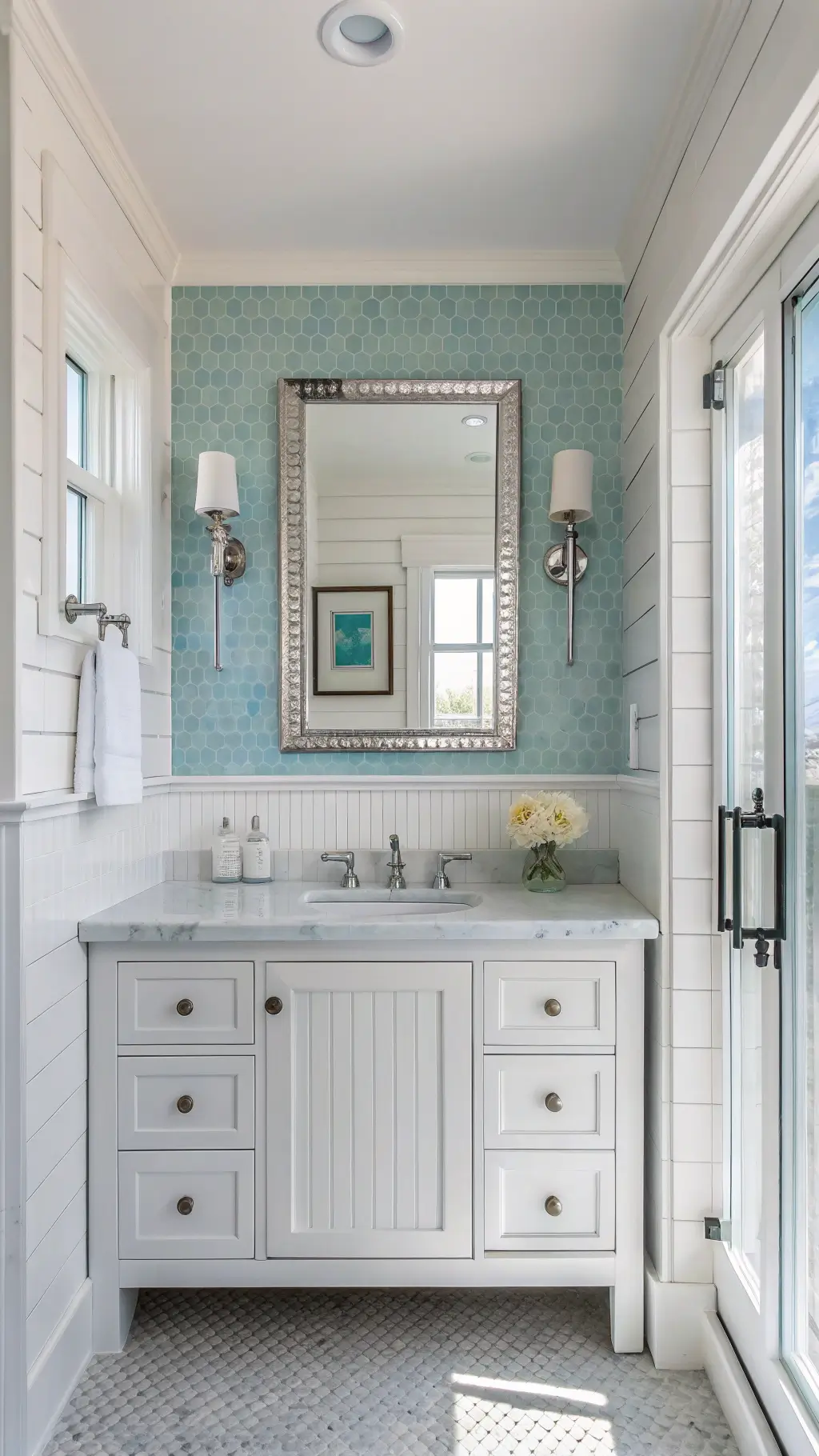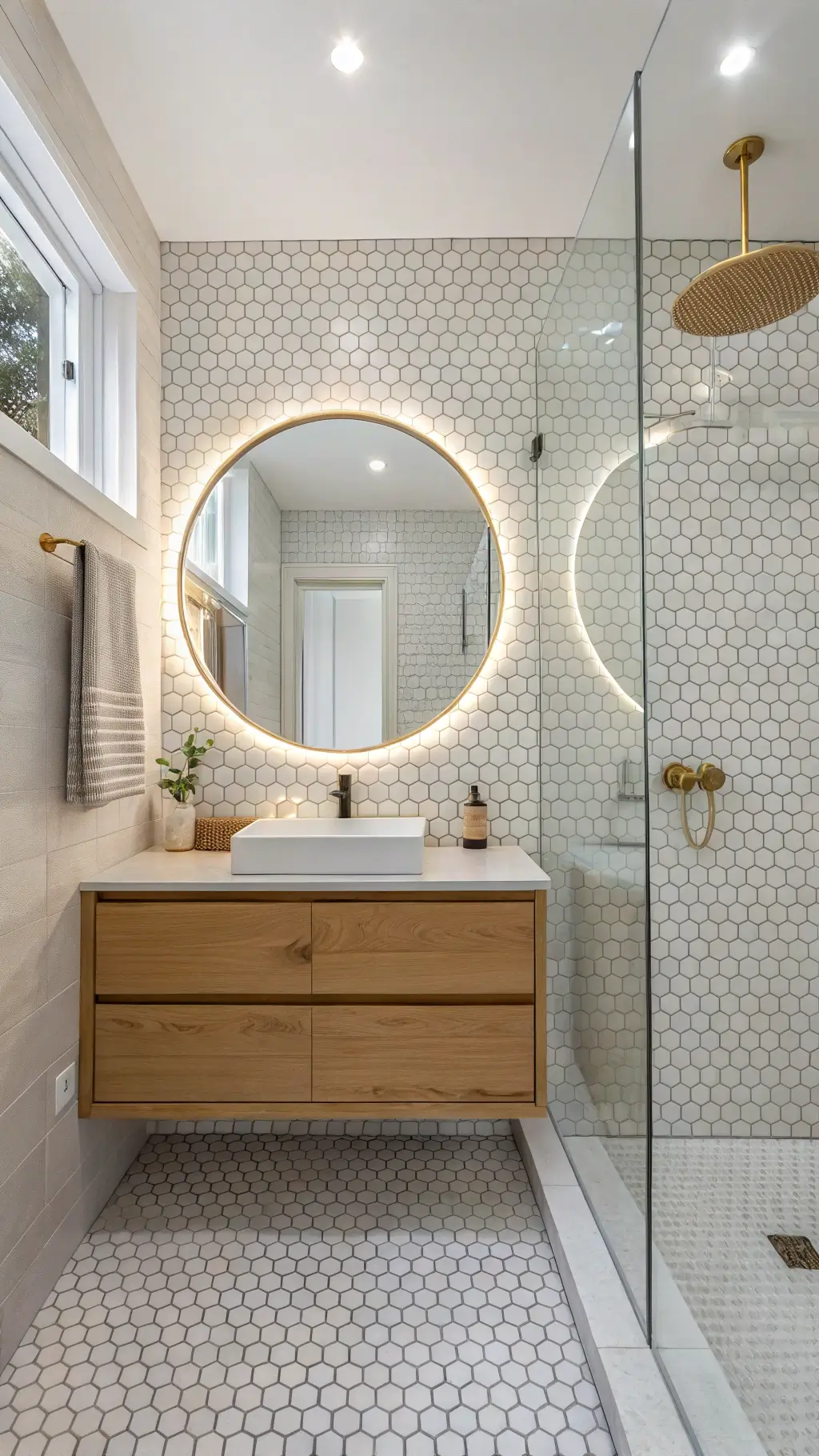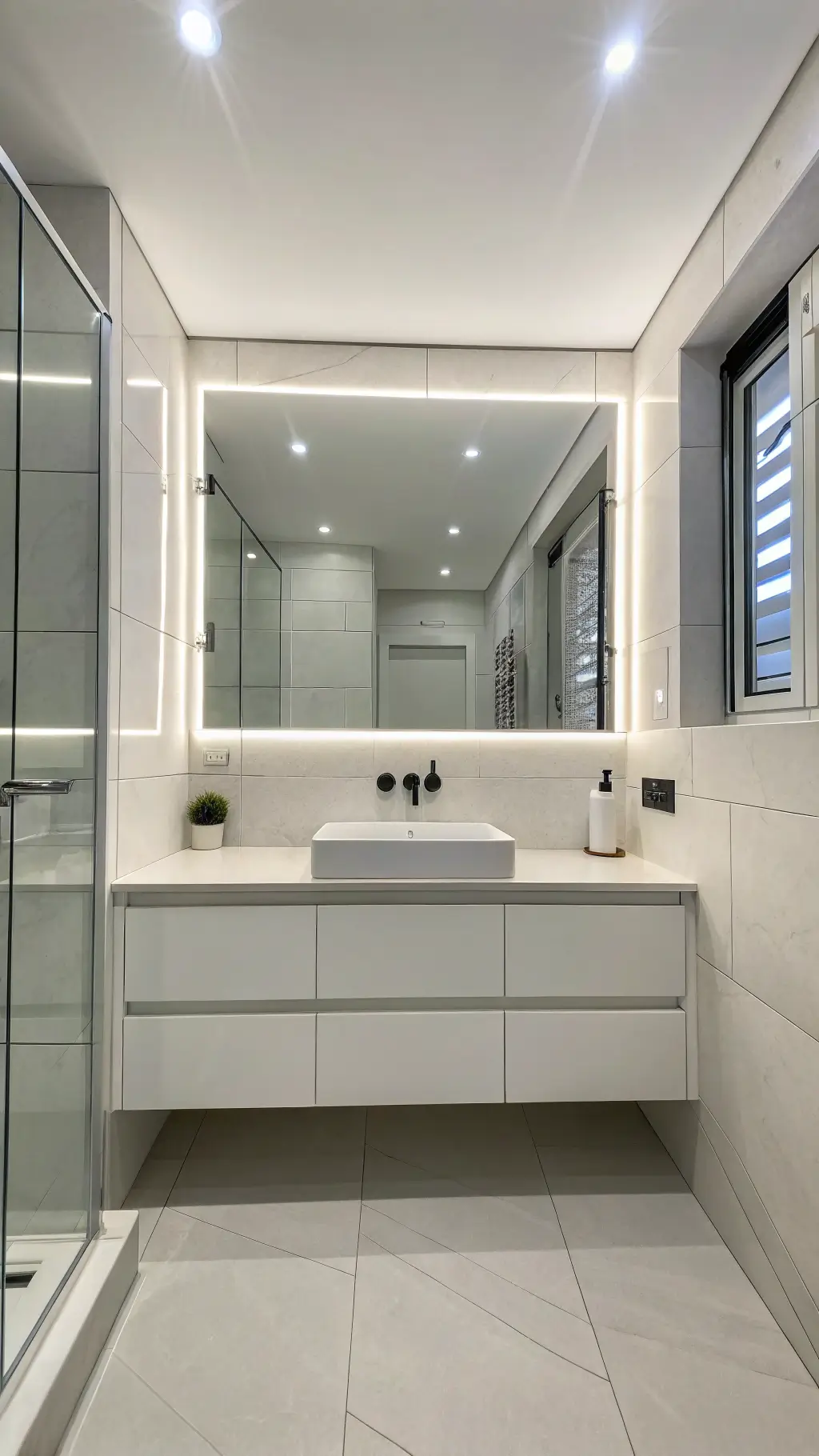 - Add accent lighting near mirrors