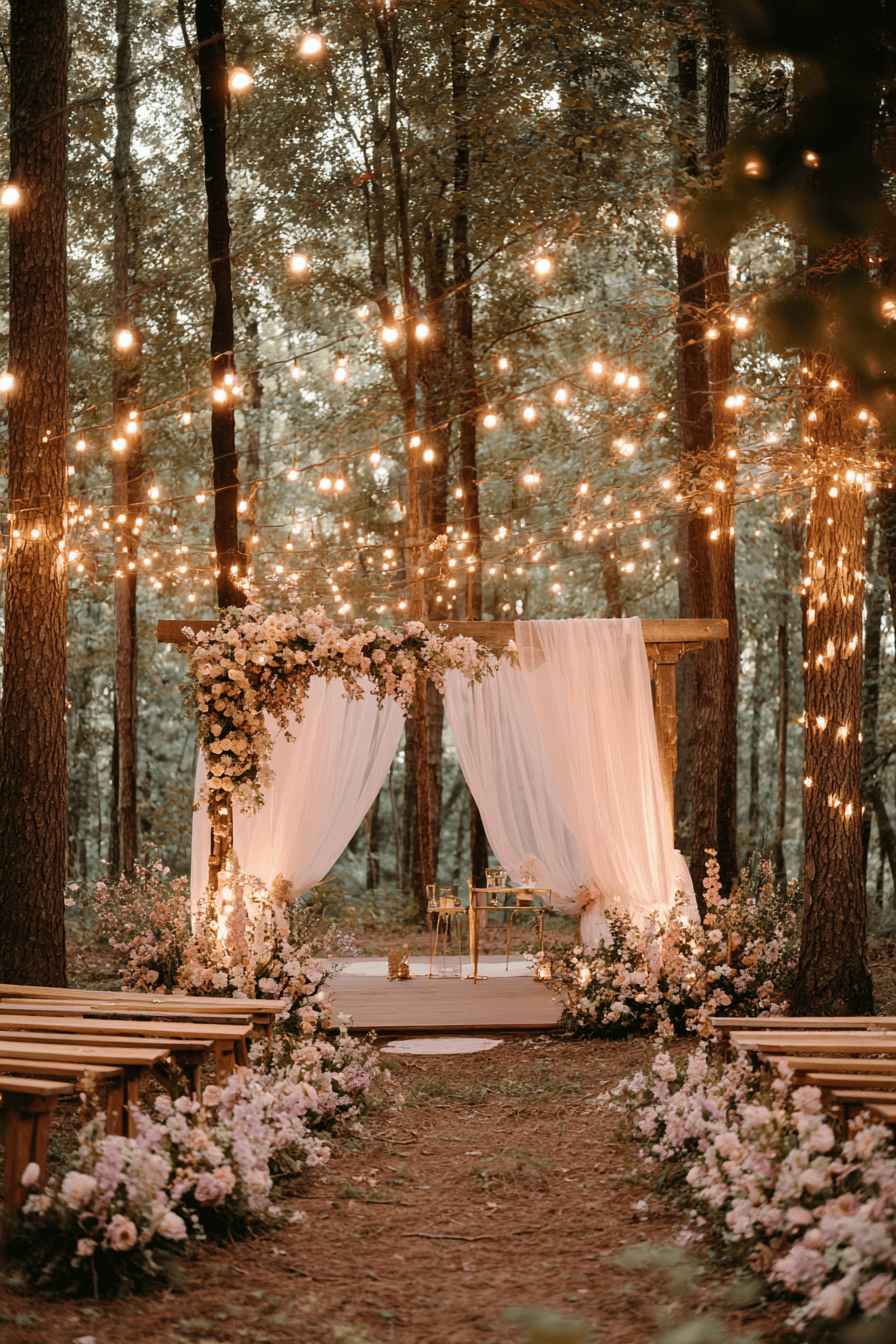 Soft lighting and airy details turn small wedding ideas into a magical, storybook-inspired celebration. Flowing fabrics and pastel florals create a dreamy atmosphere that feels intimate and romantic. String lights overhead add a glowing charm that enhances every moment. Personal touches like handwritten vows make the experience even more meaningful. The entire setting feels enchanting and unforgettable. Tap to bring this fairytale vision to life.