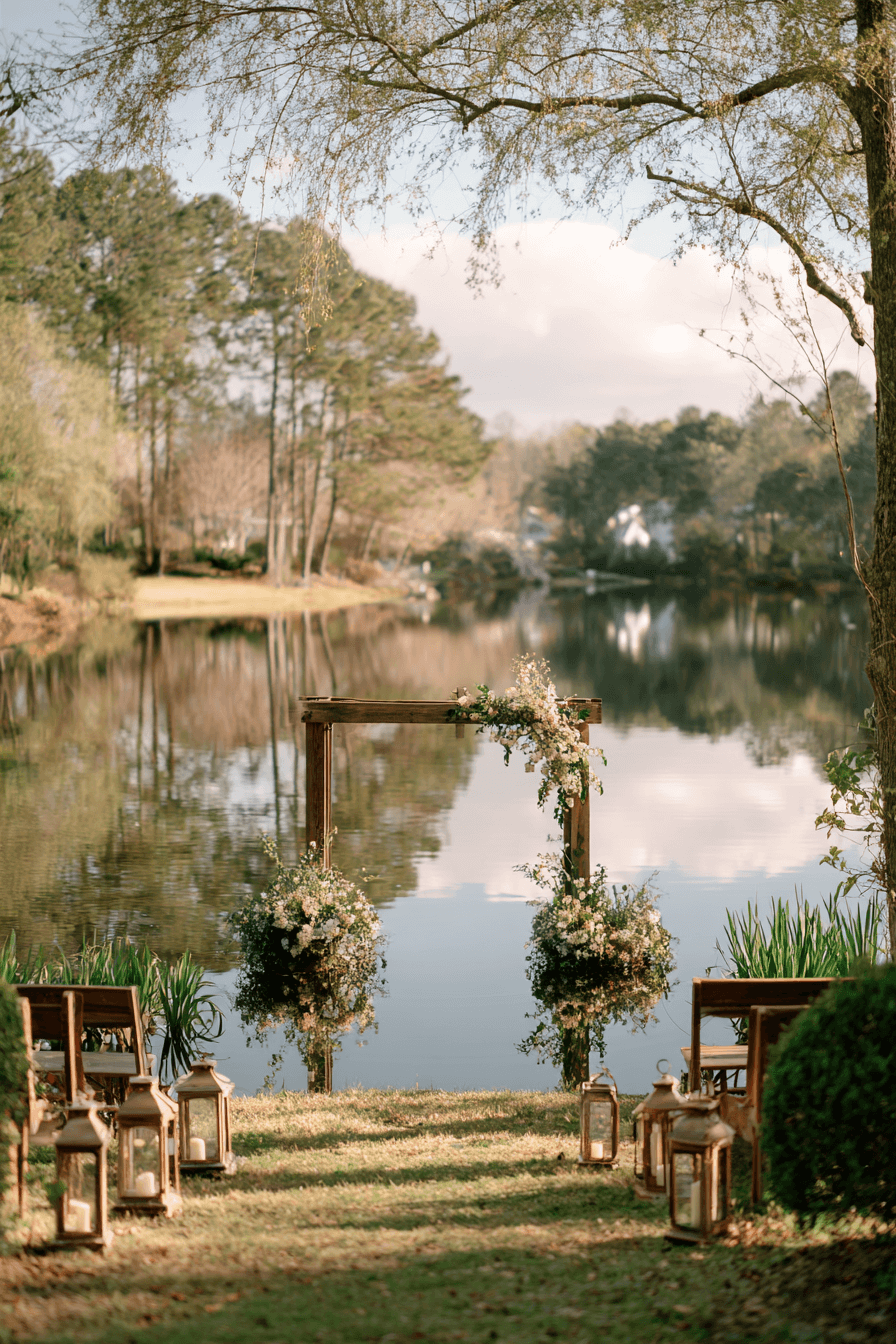 Calm water views bring serenity to small wedding ideas with a lakeside backdrop. Natural reflections and greenery create a soft, romantic environment. Simple decor keeps the focus on the surroundings. Lanterns or florals add subtle elegance. The mood feels quiet and meaningful. Create a lakeside moment to remember.