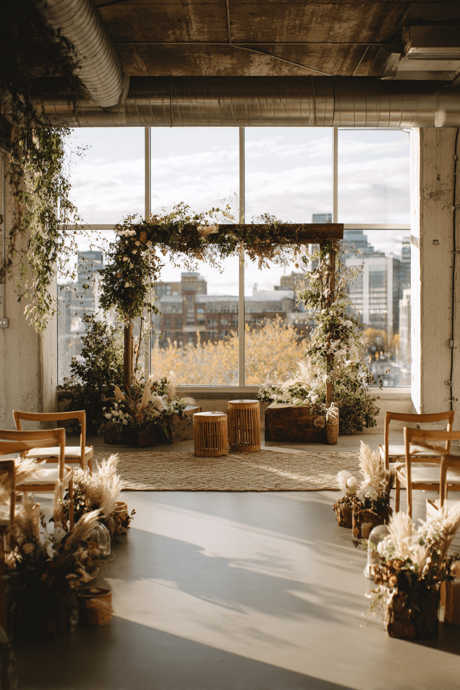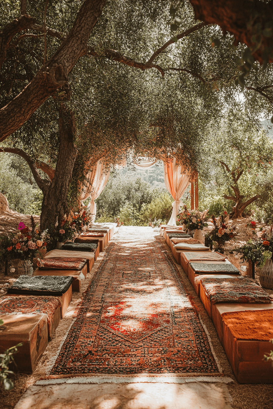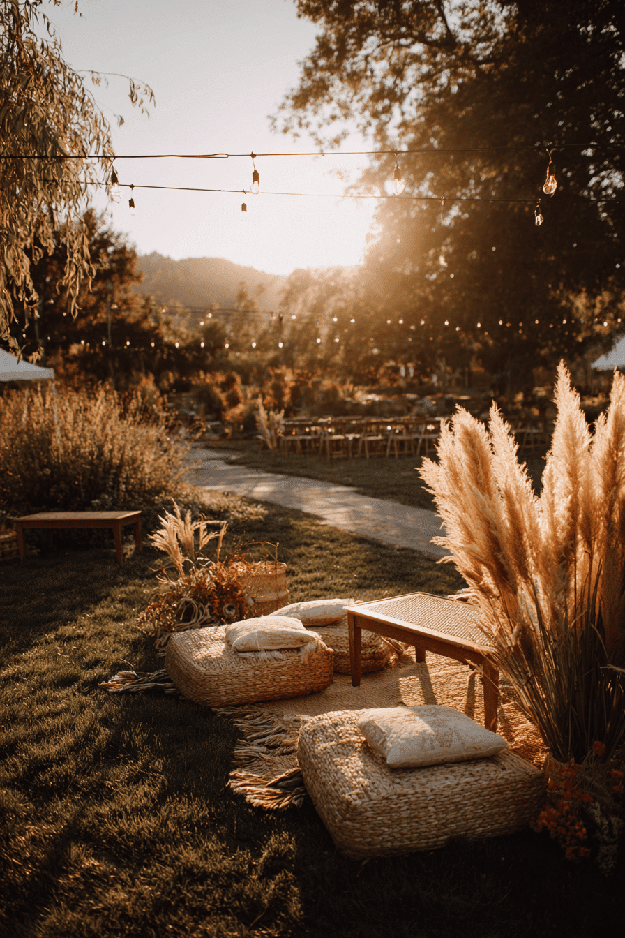 Layered textures and relaxed styling give small wedding ideas a cozy bohemian feel. Rugs, flowing fabrics, and earthy tones create a warm, inviting environment. Natural elements add depth and personality throughout the space. The look feels effortless and free-spirited. Personal touches make everything feel unique. Style your celebration with boho flair.