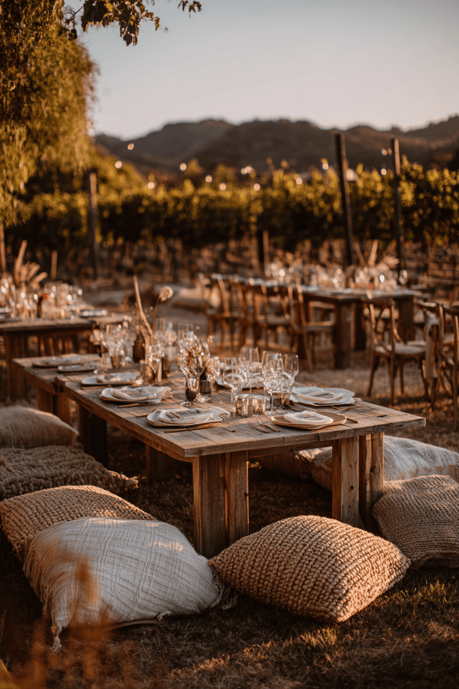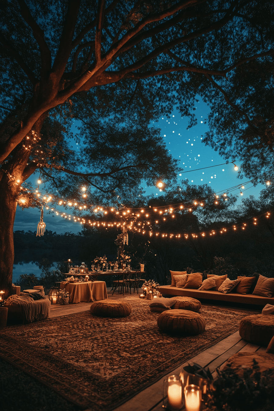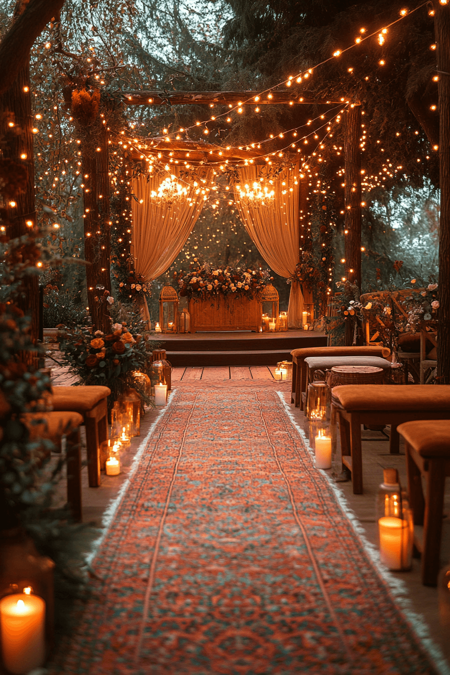 Layered textures and relaxed styling give small wedding ideas a cozy bohemian feel. Rugs, flowing fabrics, and earthy tones create a warm, inviting environment. Natural elements add depth and personality throughout the space. The look feels effortless and free-spirited. Personal touches make everything feel unique. Style your celebration with boho flair.
